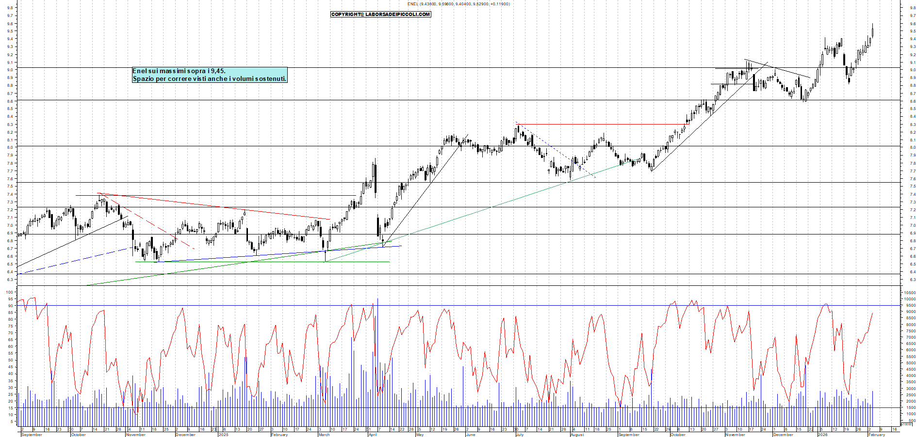 ENEL: Enel sui massimi sopra i 9,45. Spazio per correre visti anche i volumi sostenuti.