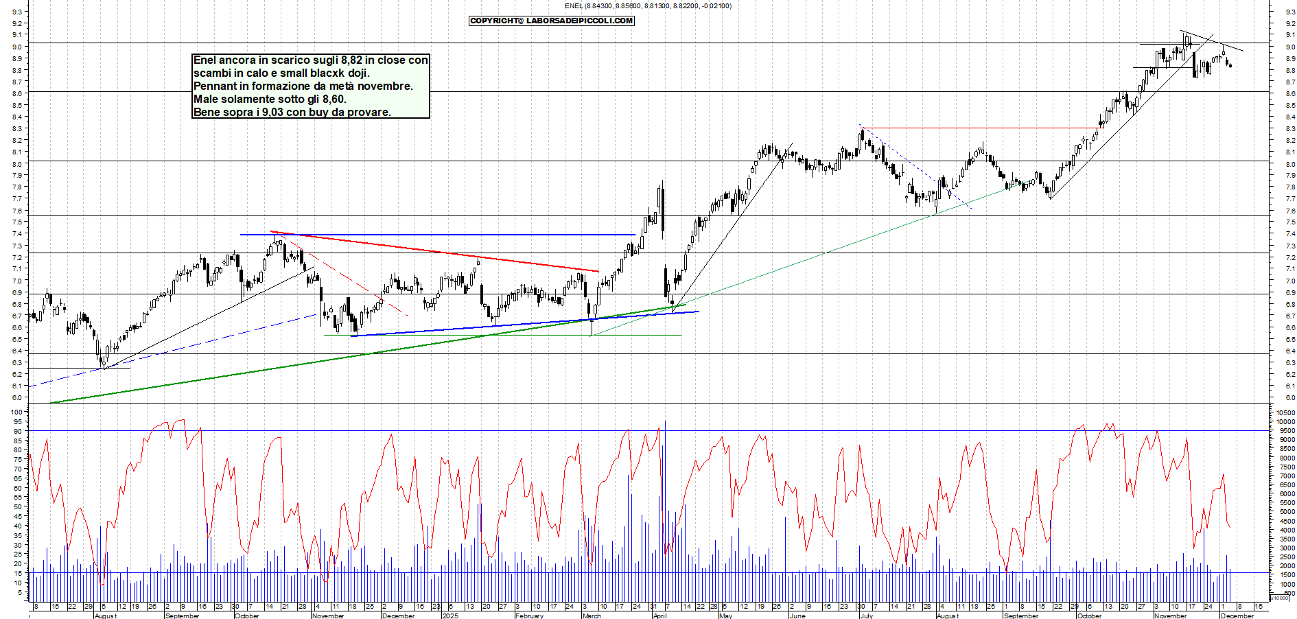 ENEL: Enel ancora in scarico sugli 8,82 in close con scambi in calo e small blacxk doji. Pennant in formazione da metà novembre. Male solamente sotto gli 8,60. Bene sopra i 9,03 con buy da provare.