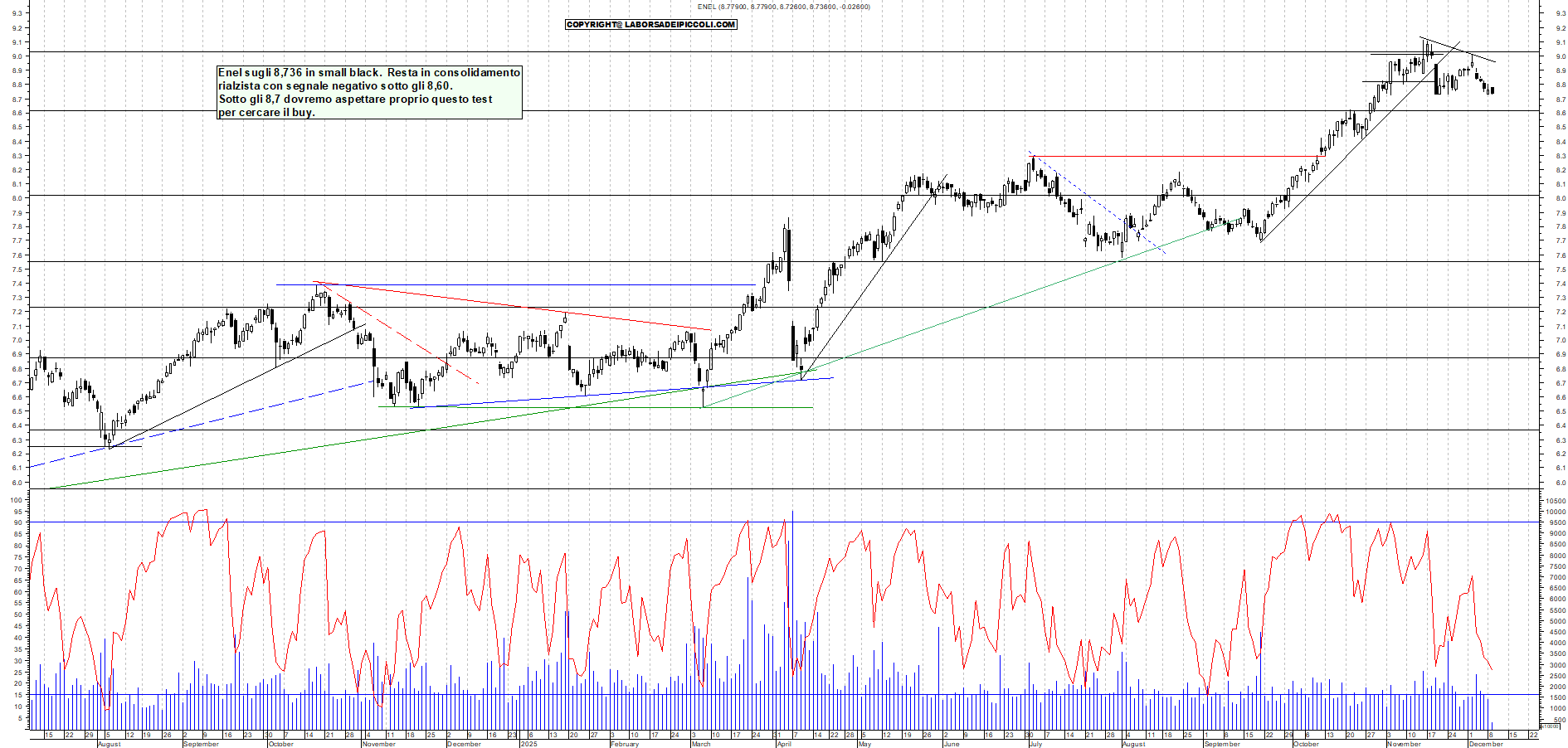 ENEL: Enel sugli 8,736 in small black. Resta in consolidamento rialzista con segnale negativo sotto gli 8,60. Sotto gli 8,7 dovremo aspettare proprio questo test per cercare il buy.