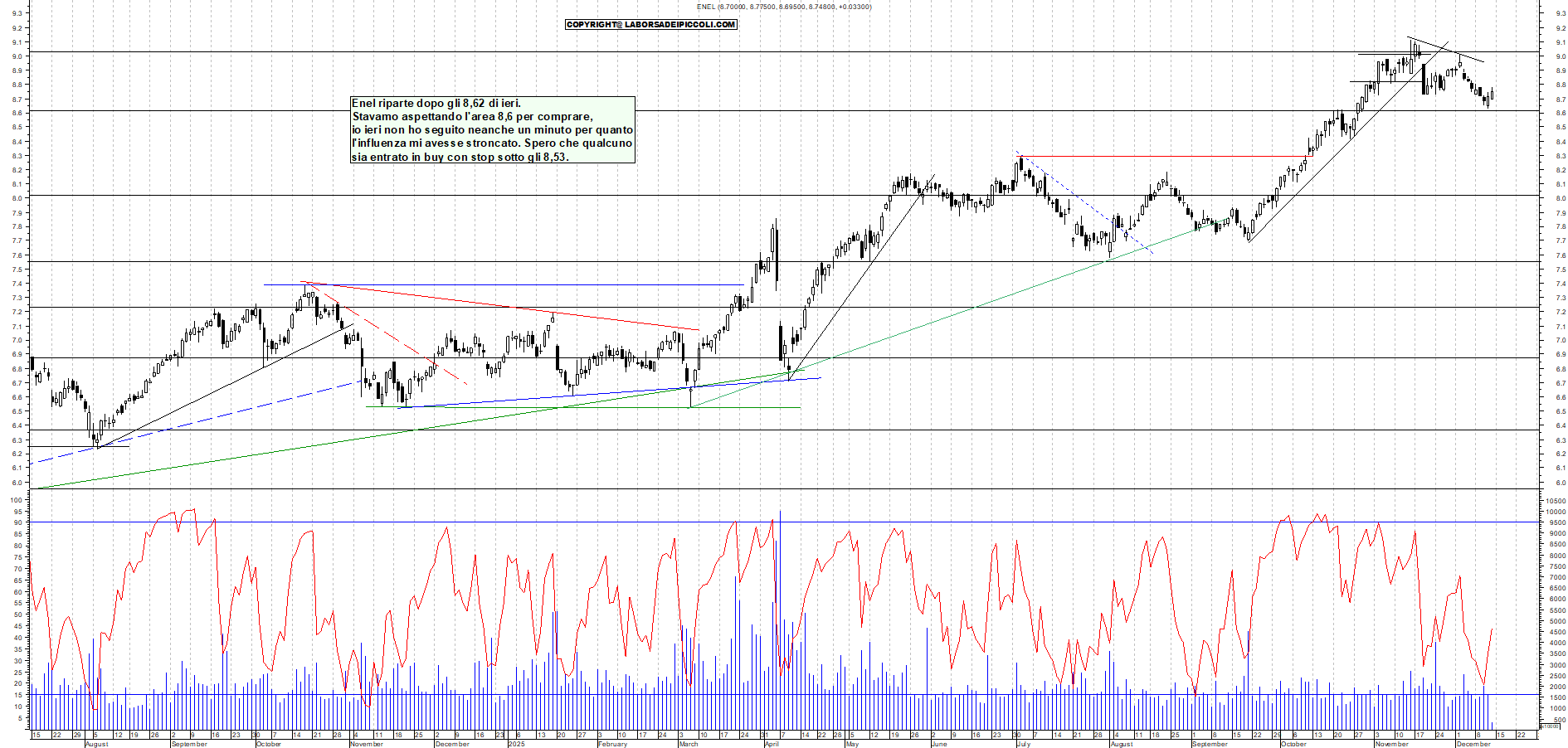 ENEL: Enel riparte dopo gli 8,62 di ieri. Stavamo aspettando l'area 8,6 per comprare, io ieri non ho seguito neanche un minuto per quanto l'influenza mi avesse stroncato. Spero che qualcuno sia entrato in buy con stop sotto gli 8,53.