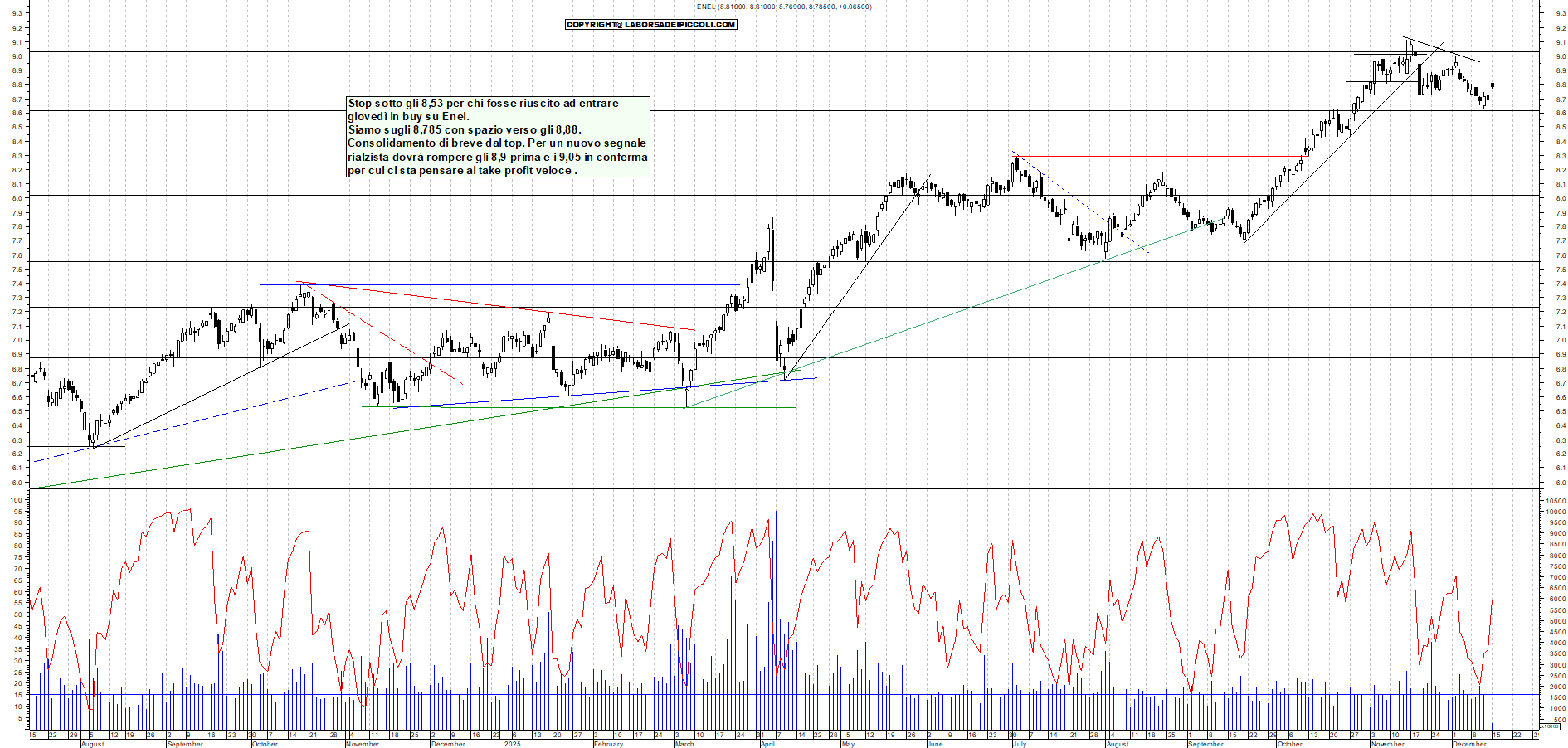 ENEL: Stop sotto gli 8,53 per chi fosse riuscito ad entrare giovedì in buy su Enel. Siamo sugli 8,785 con spazio verso gli 8,88. Consolidamento di breve dal top. Per un nuovo segnale rialzista dovrà rompere gli 8,9 prima e i 9,05 in conferma per cui ci sta pensare al take profit veloce .