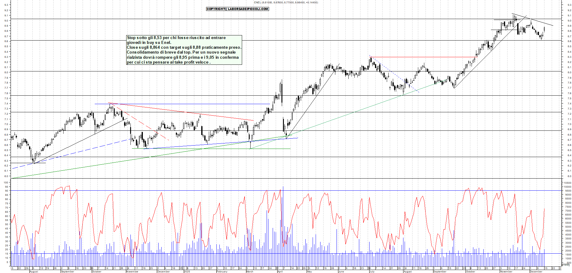 ENEL: Stop sotto gli 8,53 per chi fosse riuscito ad entrare giovedì in buy su Enel. Close sugli 8,864 con target sugli 8,88 praticamente preso. Consolidamento di breve dal top. Per un nuovo segnale rialzista dovrà rompere gli 8,95 prima e i 9,05 in conferma per cui ci sta pensare al take profit veloce .
