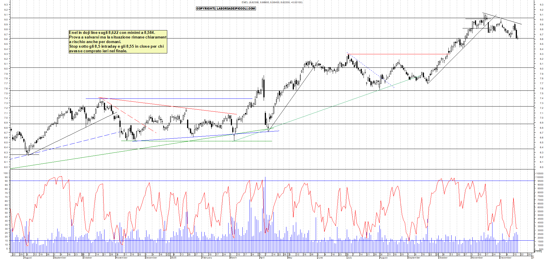 ENEL: Enel in doji line sugli 8,622 con minimi a 8,584. Prova a salvarsi ma la situazione rimane chiarament a rischio anche per domani. Stop sotto gli 8,5 intraday e gli 8,55 in close per chi avesse comprato ieri nel finale.