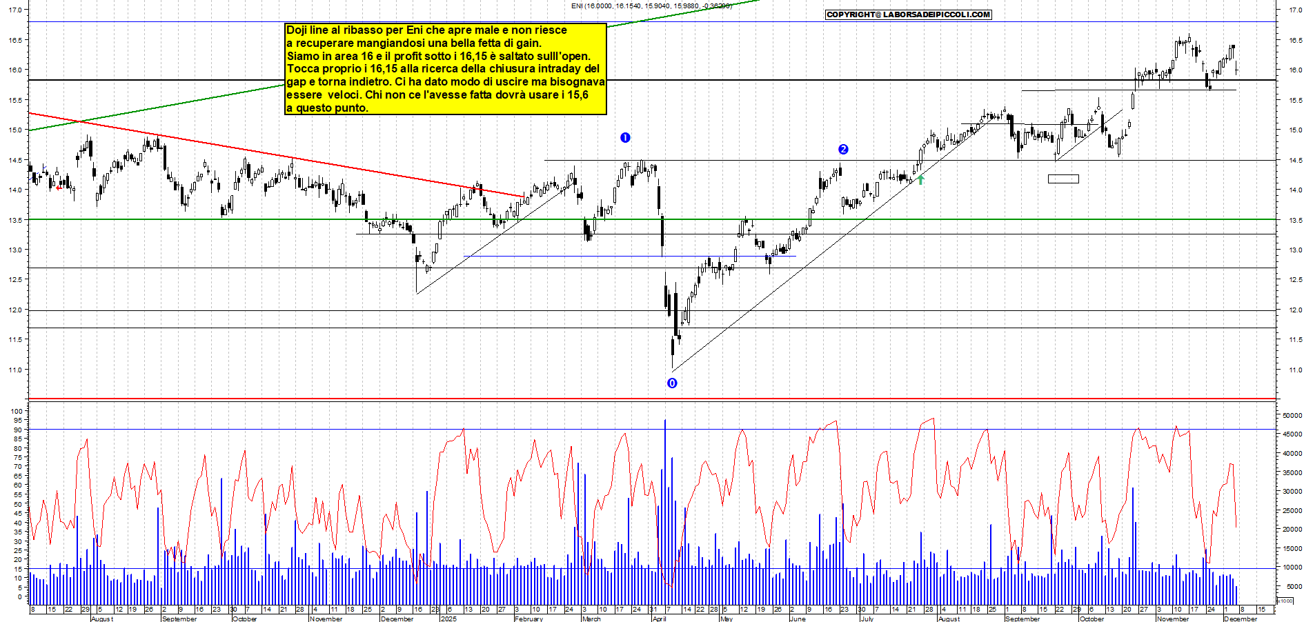 ENI: Doji line al ribasso per Eni che apre male e non riesce a recuperare mangiandosi una bella fetta di gain. Siamo in area 16 e il profit sotto i 16,15 è saltato sulll'open. Tocca proprio i 16,15 alla ricerca della chiusura intraday del gap e torna indietro. Ci ha dato modo di uscire ma bisognava essere veloci. Chi non ce l'avesse fatta dovrà usare i 15,6 a questo punto.