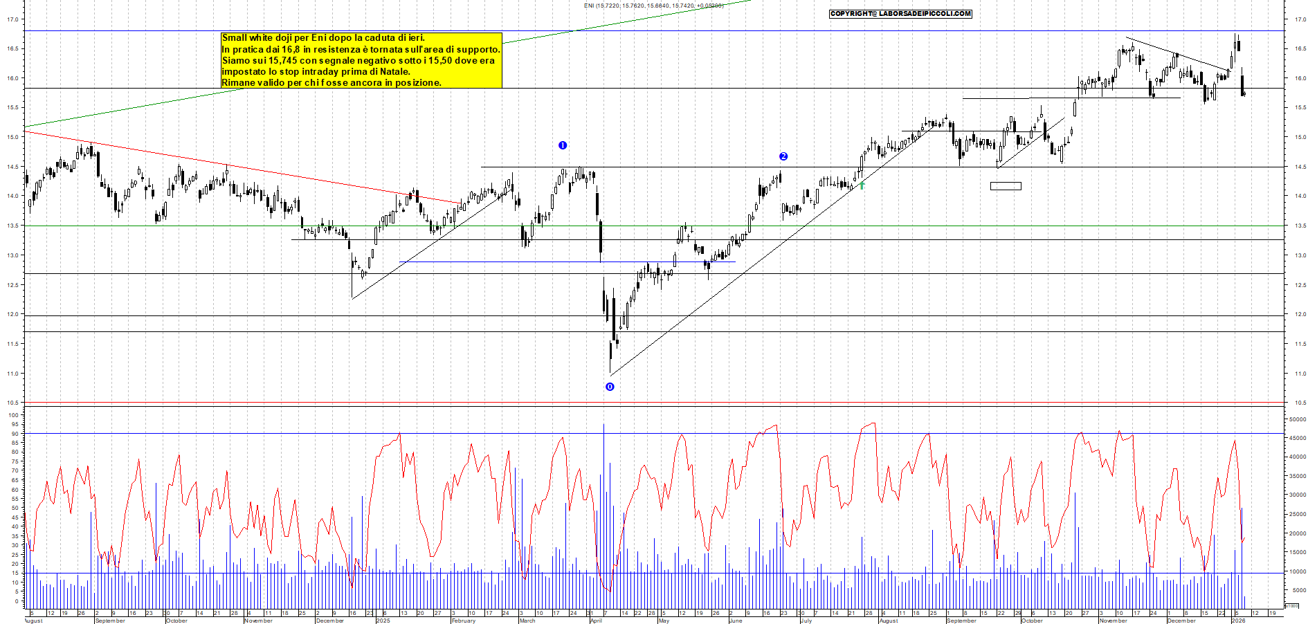 ENI: Small white doji per Eni dopo la caduta di ieri. In pratica dai 16,8 in resistenza è tornata sull'area di supporto. Siamo sui 15,745 con segnale negativo sotto i 15,50 dove era impostato lo stop intraday prima di Natale. Rimane valido per chi f osse ancora in posizione.