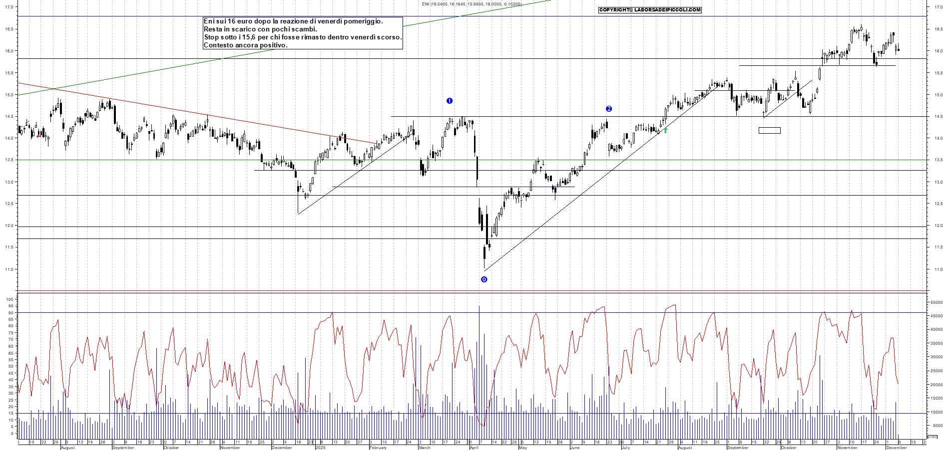 ENI: Eni sui 16 euro dopo la reazione di venerdì pomeriggio. Resta in scarico con pochi scambi. Stop sotto i 15,6 per chi fosse rimasto dentro venerdì scorso. Contesto ancora positivo.