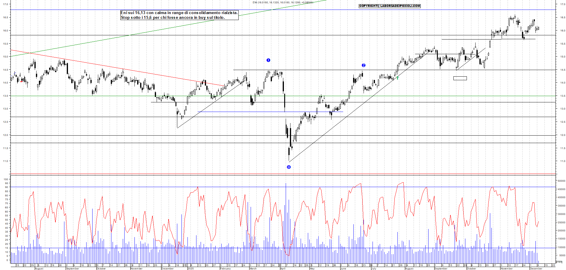 ENI: Eni sui 16,13 con calma in range di consolidamento rialzista. Stop sotto i 15,6 per chi fosse ancora in buy sul titolo.