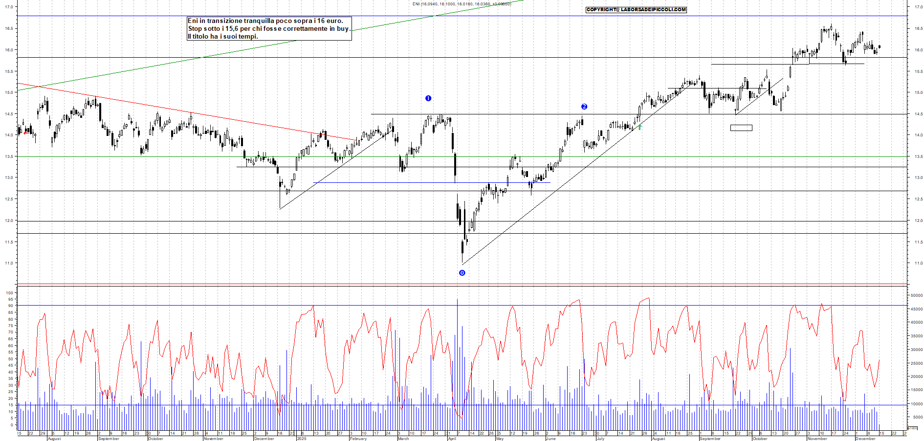 ENI: Eni in transizione tranquilla poco sopra i 16 euro. Stop sotto i 15,6 per chi fosse correttamente in buy. Il titolo ha i suoi tempi.