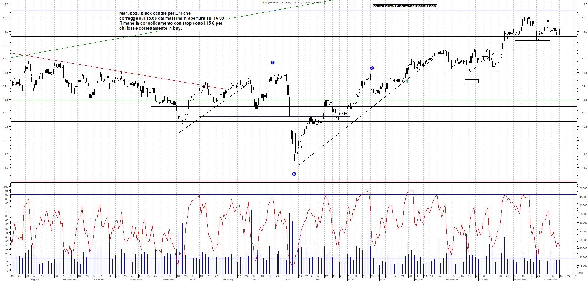 ENI: Marubozu black candle per Eni che corregge sui 15,88 dai massimi in apertura sui 16,09. Rimane in consolidamento con stop sotto i 15,6 per chi fosse correttamente in buy.