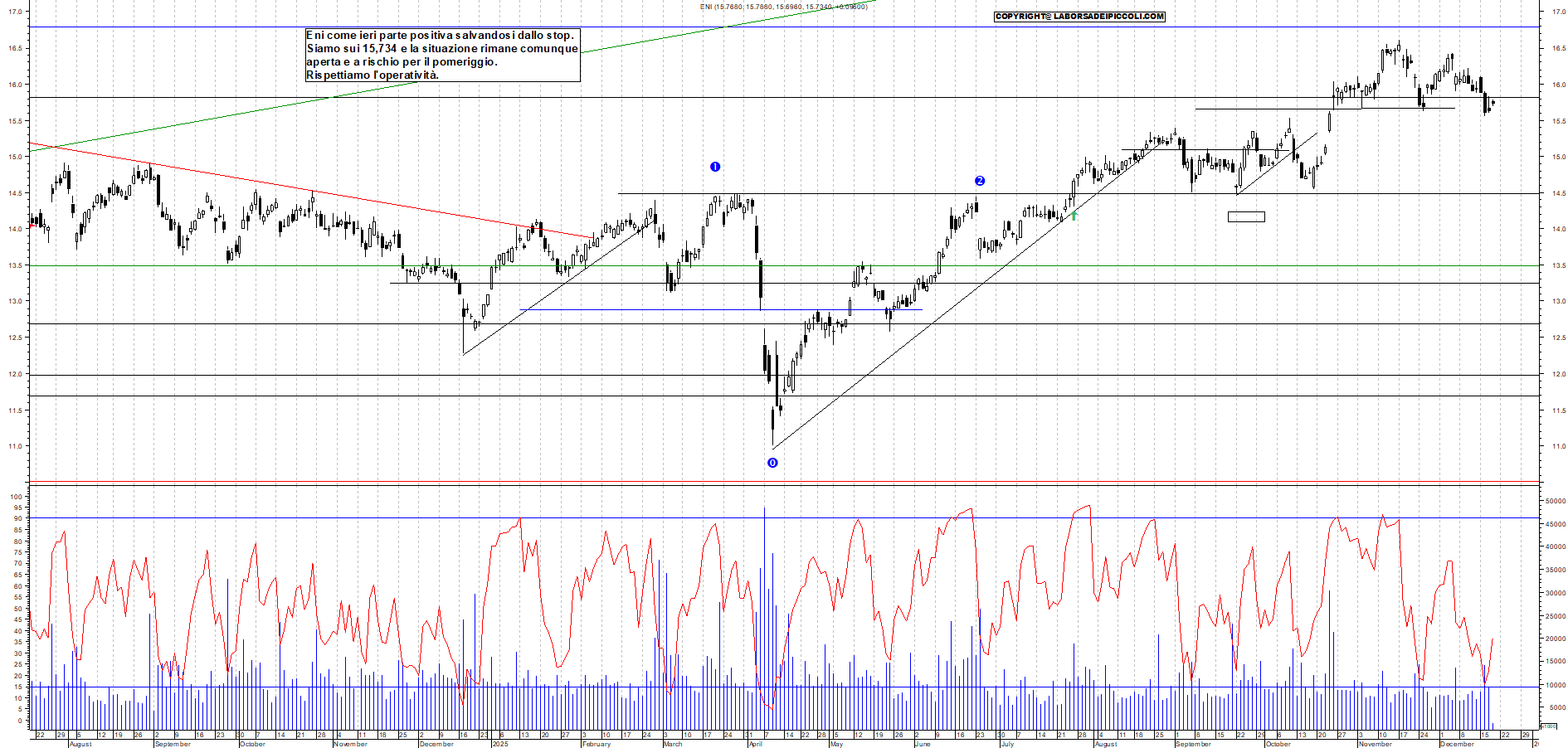 ENI: Eni come ieri parte positiva salvandosi dallo stop. Siamo sui 15,734 e la situazione rimane comunque aperta e a rischio per il pomeriggio. Rispettiamo l'operatività.