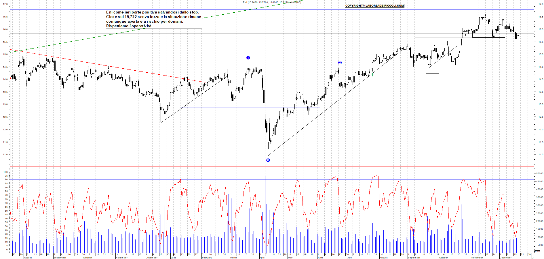 ENI: Eni come ieri parte positiva salvandosi dallo stop. Close sui 15,722 senza forza e la situazione rimane comunque aperta e a rischio per domani. Rispettiamo l'operatività.