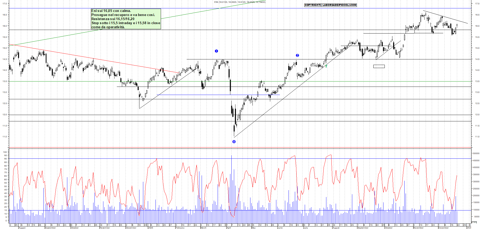 ENI: Eni sui 16,05 con calma. Prosegue nel recupero e va bene così. Resistenza sui 16,15/16,20 Stop sotto i 15,5 intraday e i 15,58 in close come da operatività.