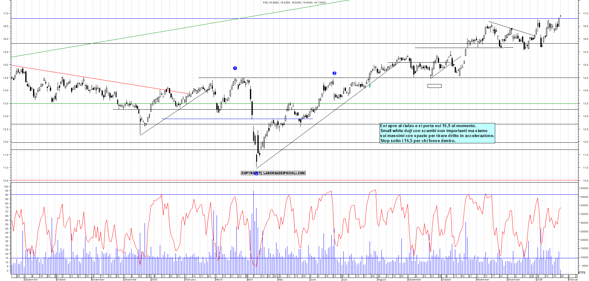 ENI: Eni apre al rialzo e si porta sui 16,9 al momento. Small white doji con scambi non importanti ma siamo sui massimi con spazio per tirare dritto in accelerazione. Stop sotto i 16,5 per chi fosse dentro.