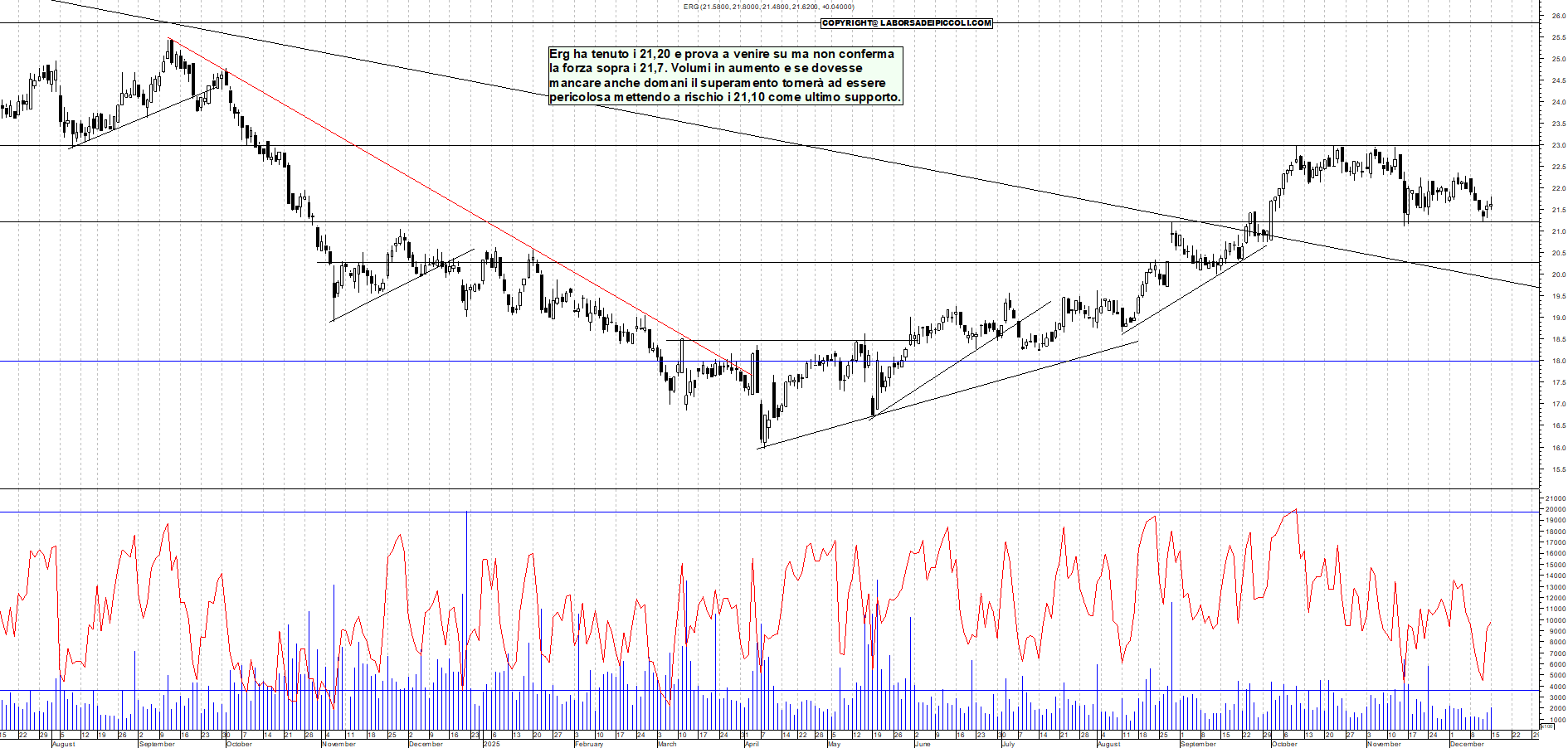 ERG: Erg ha tenuto i 21,20 e prova a venire su ma non conferma la forza sopra i 21,7. Volumi in aumento e se dovesse mancare anche domani il superamento tornerà ad essere pericolosa mettendo a rischio i 21,10 come ultimo supporto.