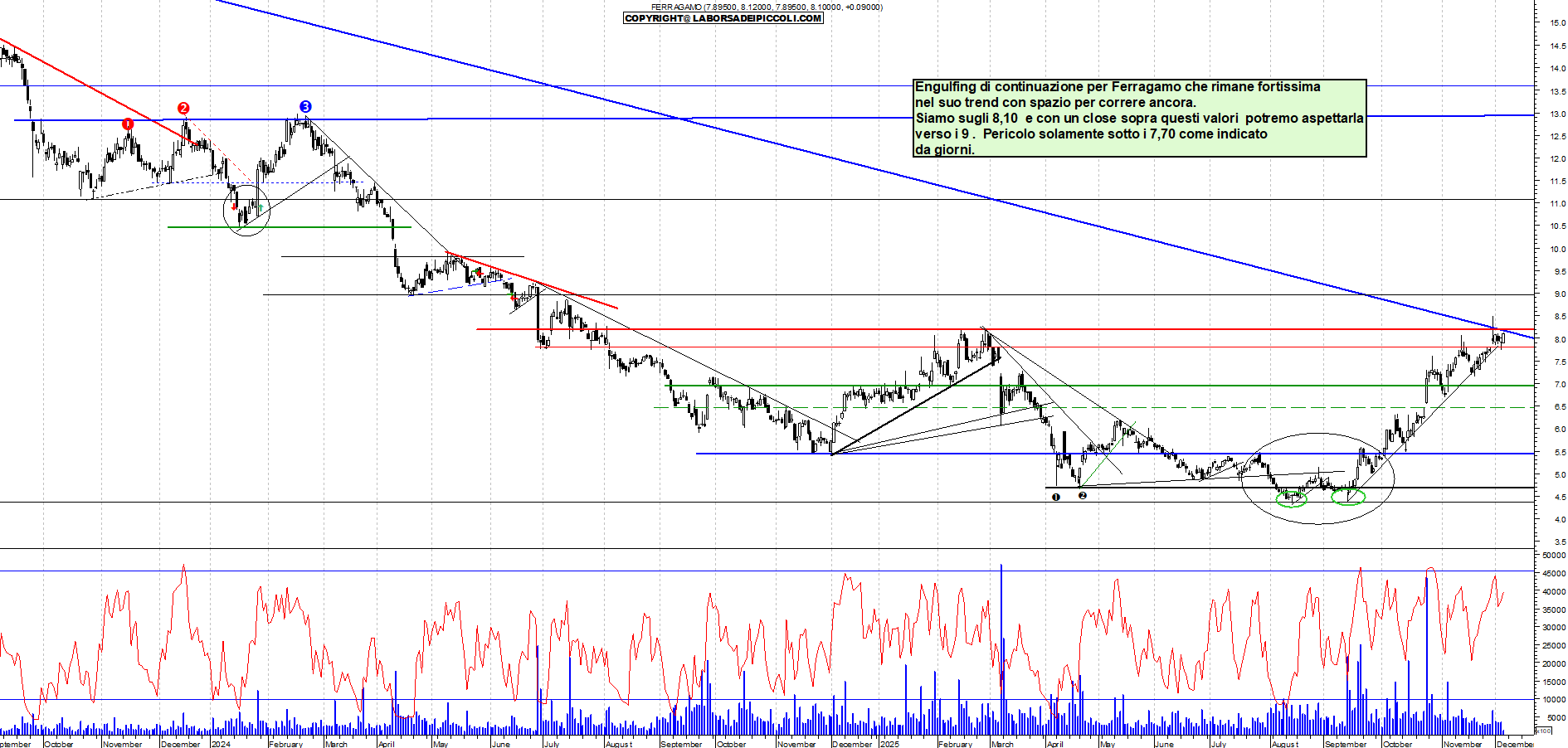 FERRAGAMO: Engulfing di continuazione per Ferragamo che rimane fortissima nel suo trend con spazio per correre ancora. Siamo sugli 8,10 e con un close sopra questi valori potremo aspettarla verso i 9 . Pericolo solamente sotto i 7,70 come indicato da giorni.