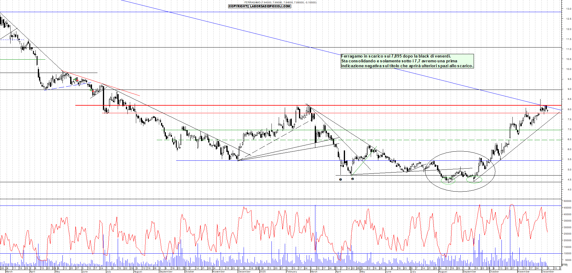 FERRAGAMO: Ferragamo in scarico sui 7,895 dopo la black di venerdì. Sta consolidando e solamente sotto i 7,7 avremo una prima indicazione negativa sul titolo che aprirà ulteriori spazi allo scarico.