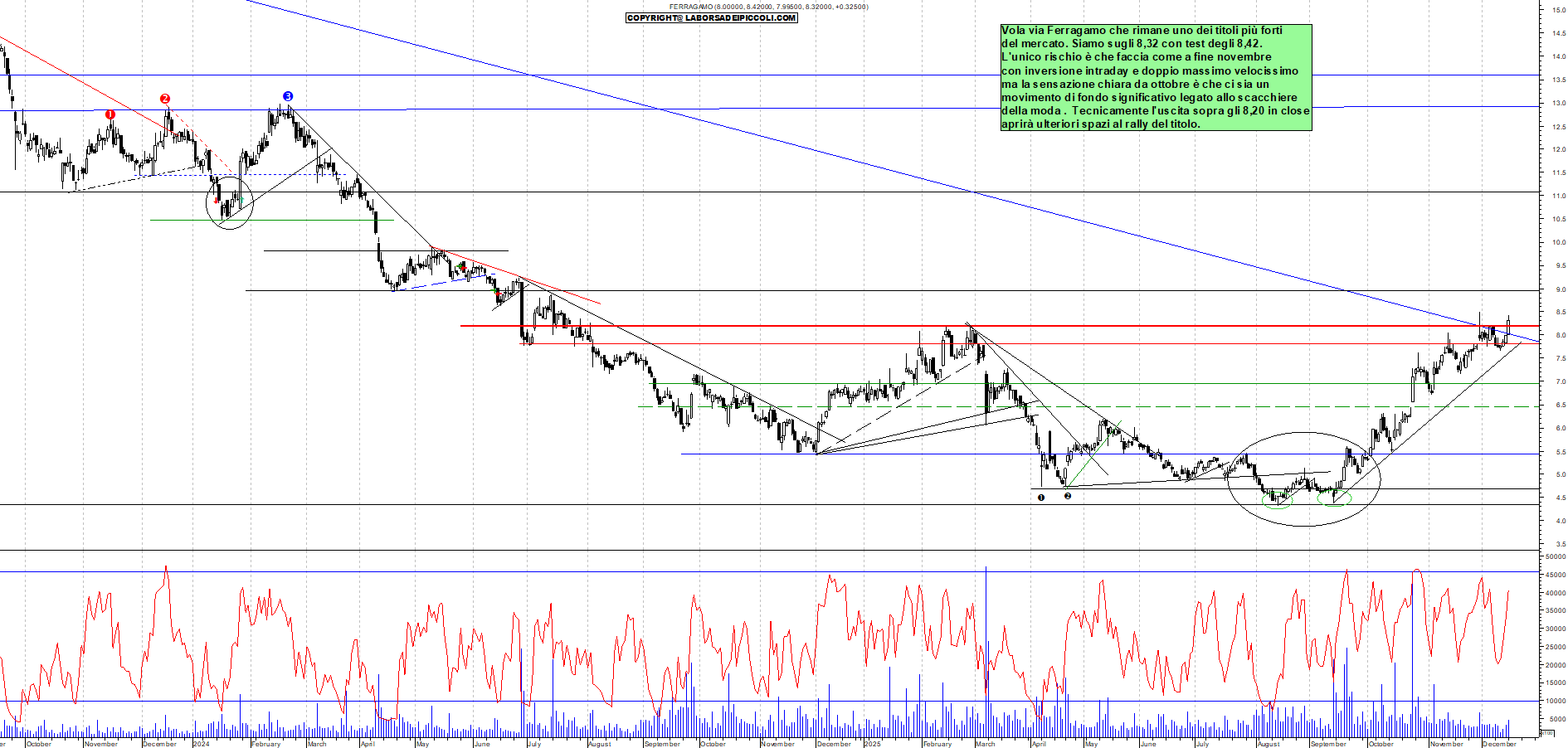 FERRAGAMO: Vola via Ferragamo che rimane uno dei titoli più forti del mercato. Siamo sugli 8,32 con test degli 8,42. L'unico rischio è che faccia come a fine novembre con inversione intraday e doppio massimo velocissimo ma la sensazione chiara da ottobre è che ci sia un movimento di fondo significativo legato allo scacchiere della moda . Tecnicamente l'uscita sopra gli 8,20 in close aprirà ulteriori spazi al rally del titolo.