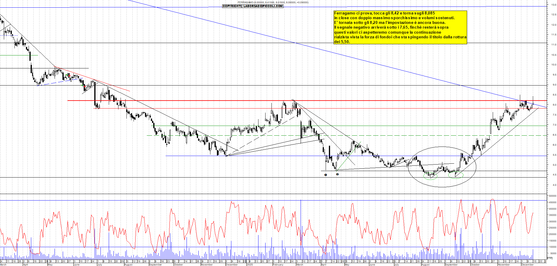 FERRAGAMO: Ferragamo ci prova, tocca gli 8,42 e torna sugli 8,085 in close con doppio massimo sporchissimo e volumi sostenuti. E' tornata sotto gli 8,20 ma l'impostazione è ancora buona. Il segnale negativo arriverà sotto i 7,65, finchè resterà sopra questi valori ci aspetteremo comunque la continuazione rialzista vista la forza di fondoi che sta spingendo il titolo dalla rottura dei 5,50.