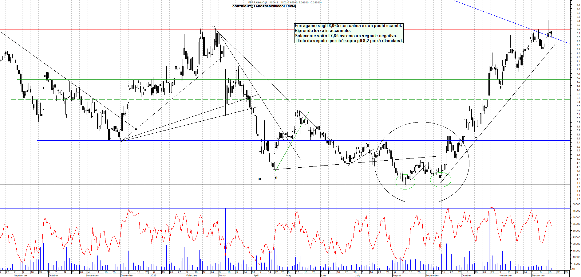 FERRAGAMO: Ferragamo sugli 8,065 con calma e con pochi scambi. Riprende forza in accumulo. Solamente sotto i 7,65 avremo un segnale negativo. Titolo da seguire perchè sopra gli 8,2 potrà rilanciarsi.