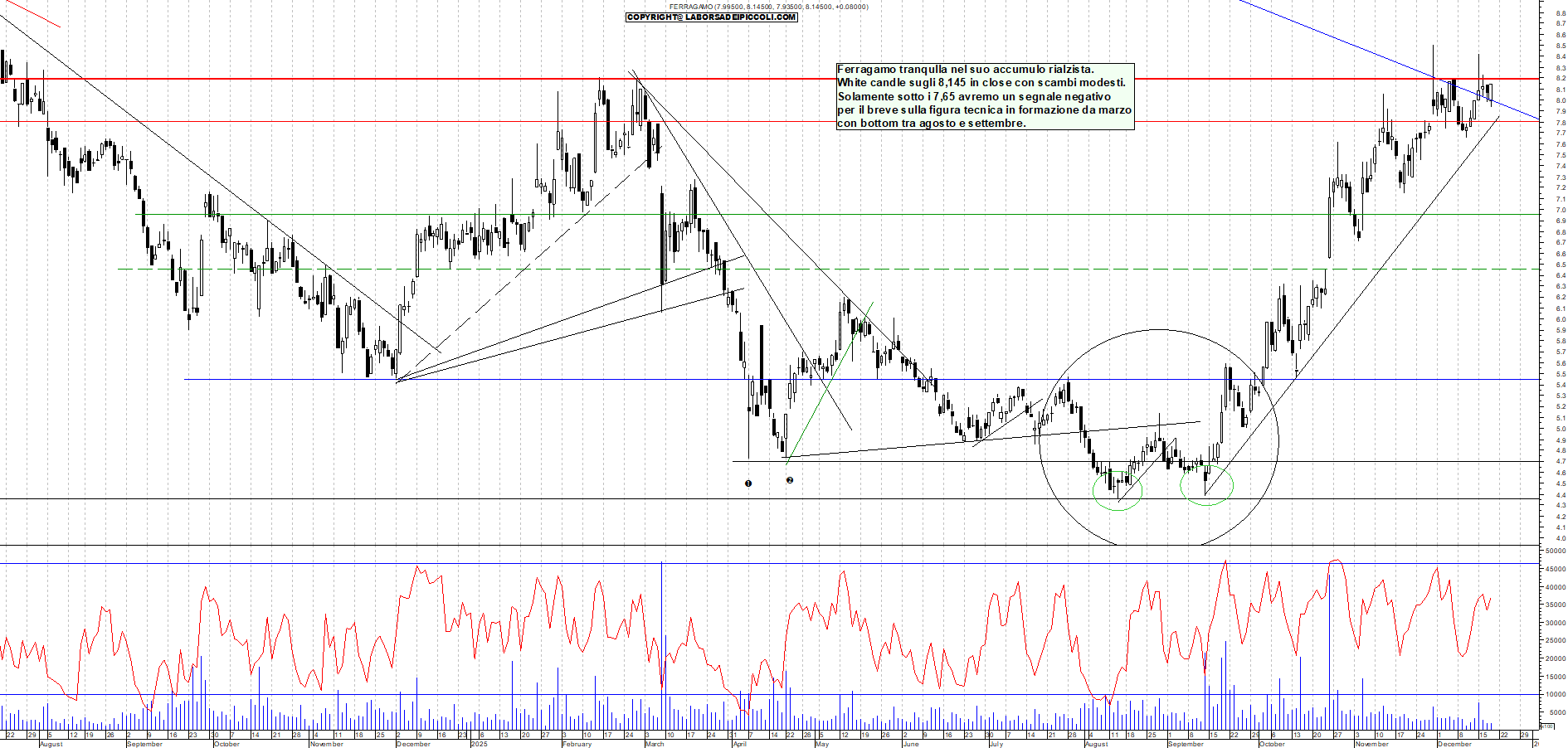 FERRAGAMO: Ferragamo tranqulla nel suo accumulo rialzista. White candle sugli 8,145 in close con scambi modesti. Solamente sotto i 7,65 avremo un segnale negativo per il breve sulla figura tecnica in formazione da marzo con bottom tra agosto e settembre.