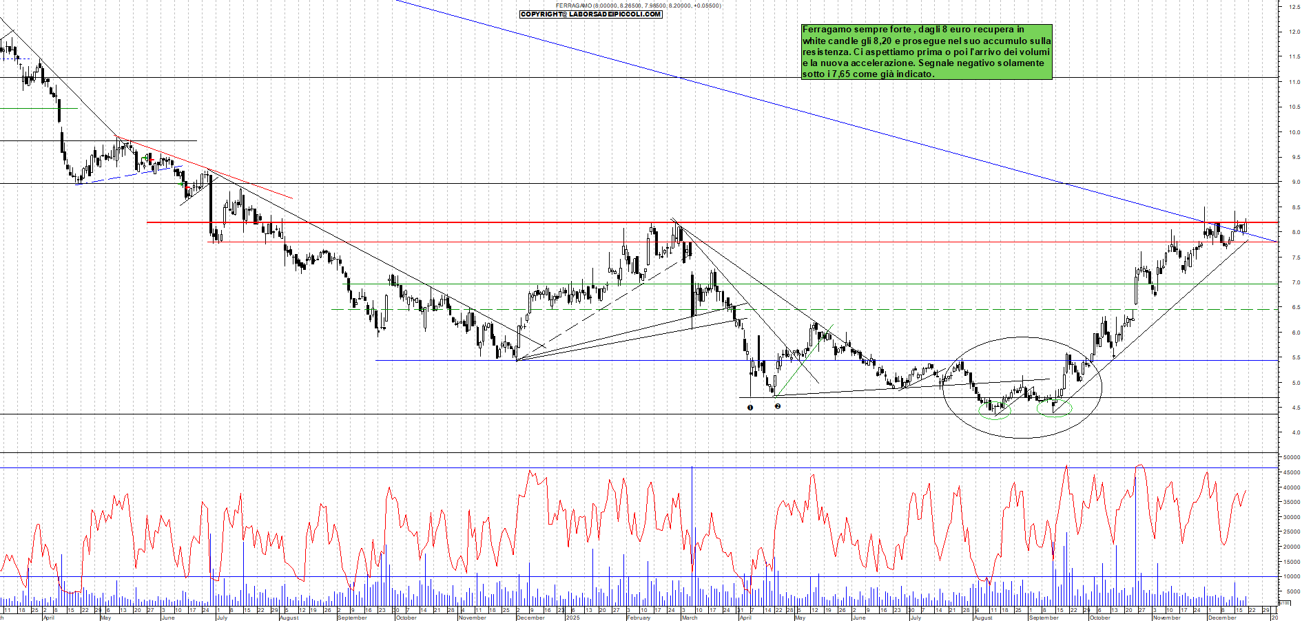 FERRAGAMO: Ferragamo sempre forte , dagli 8 euro recupera in white candle gli 8,20 e prosegue nel suo accumulo sulla resistenza. Ci aspettiamo prima o poi l'arrivo dei volumi e la nuova accelerazione. Segnale negativo solamente sotto i 7,65 come già indicato.