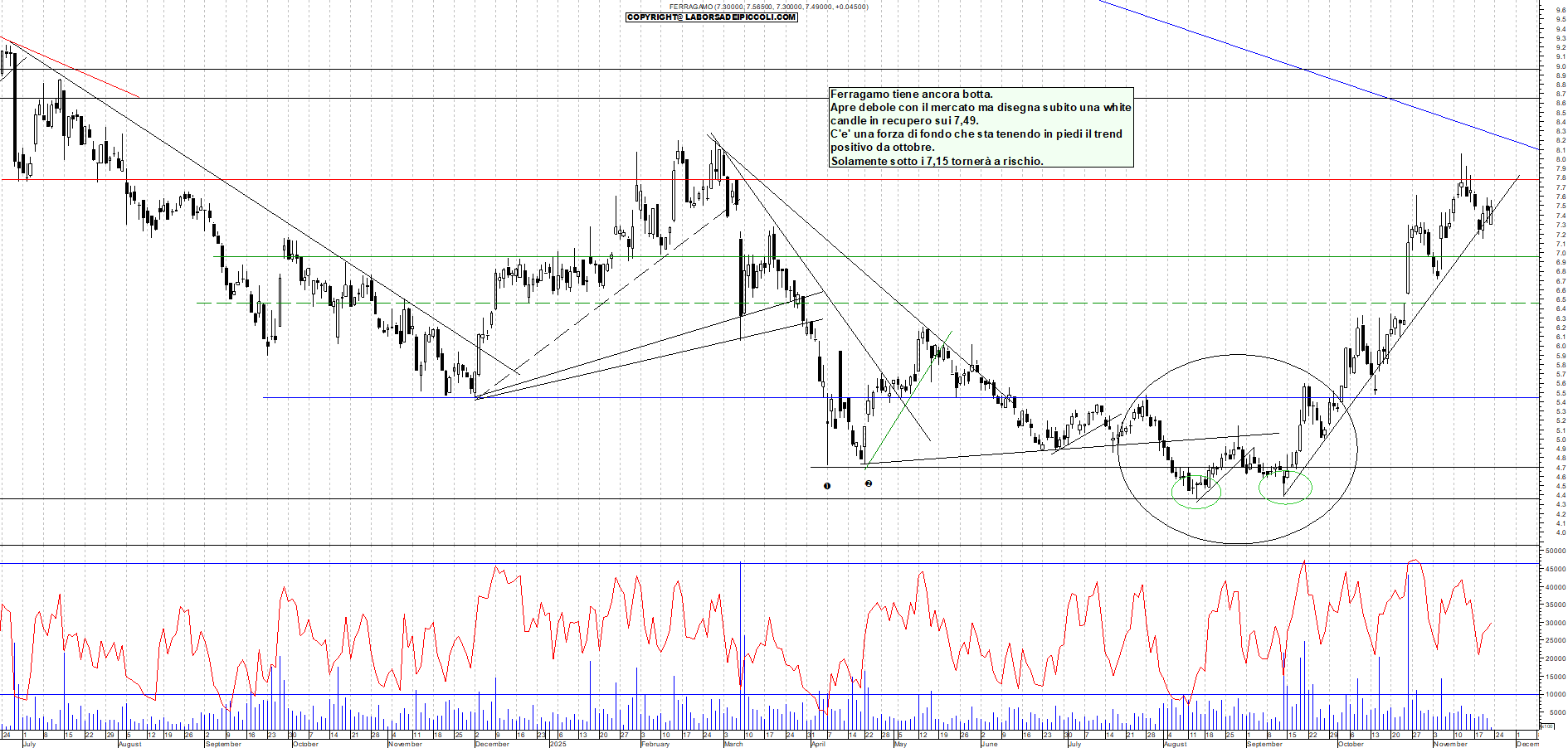FERRAGAMO: Ferragamo tiene ancora botta. Apre debole con il mercato ma disegna subito una white candle in recupero sui 7,49. C'e' una forza di fondo che sta tenendo in piedi il trend positivo da ottobre. Solamente sotto i 7,15 tornerà a rischio.