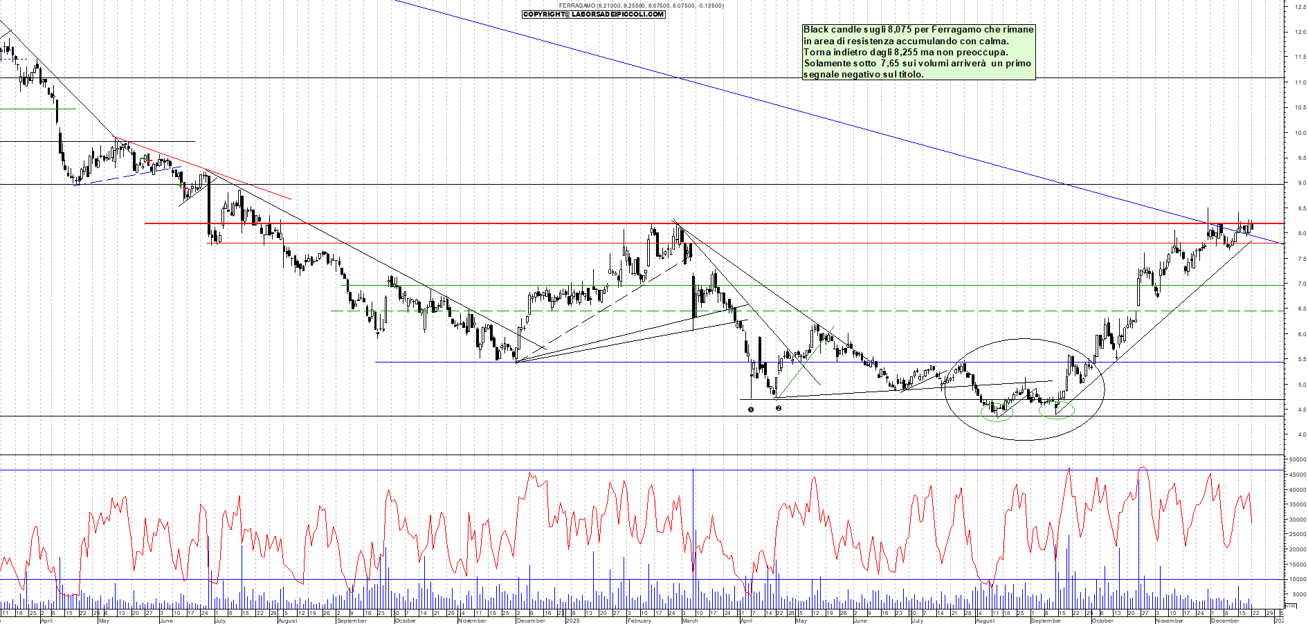 FERRAGAMO: Black candle sugli 8,075 per Ferragamo che rimane in area di resistenza accumulando con calma. Torna indietro dagli 8,255 ma non preoccupa. Solamente sotto 7,65 sui volumi arriverà un primo segnale negativo sul titolo.
