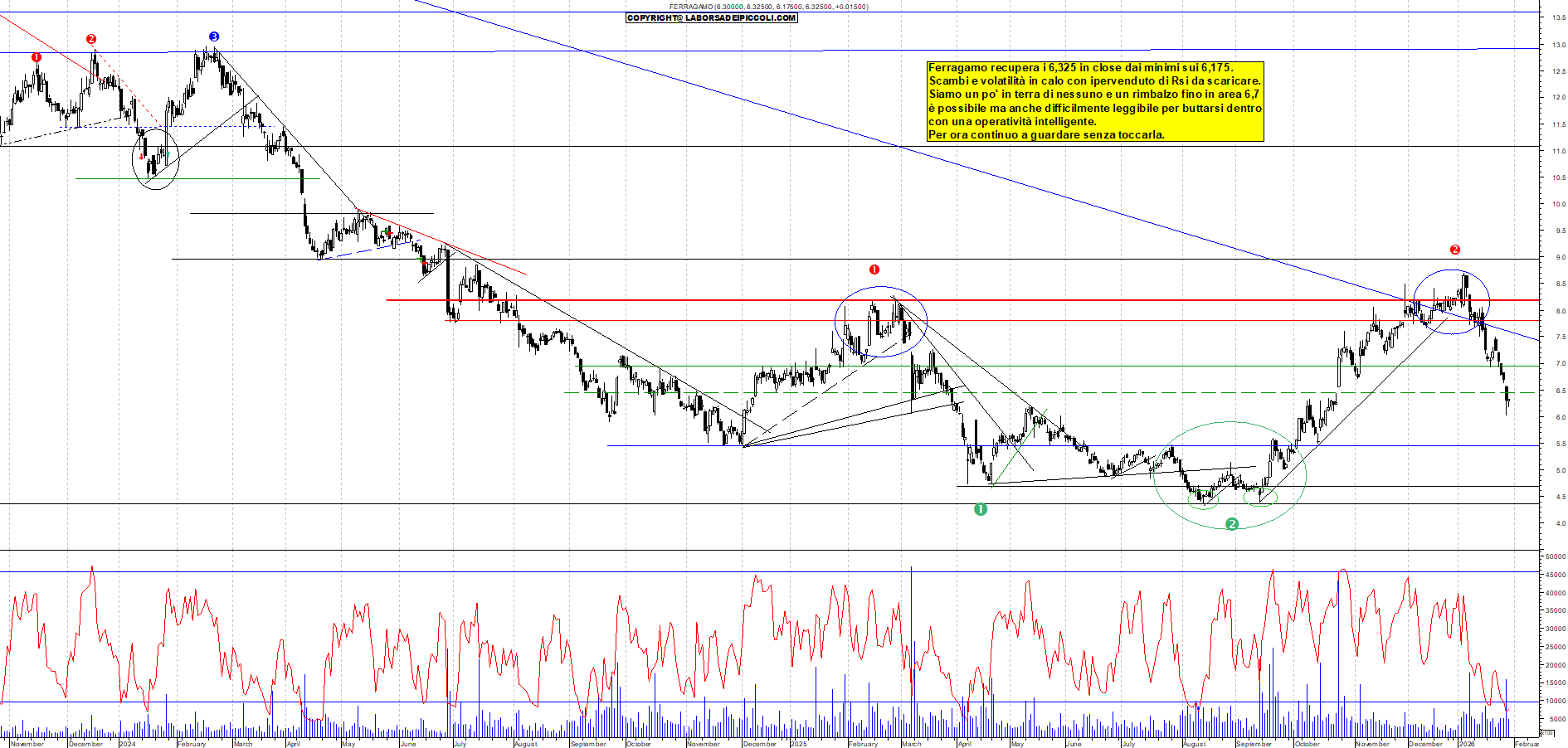 FERRAGAMO: Ferragamo recupera i 6,325 in close dai minimi sui 6,175. Scambi e volatilità in calo con ipervenduto di Rsi da scaricare. Siamo un po' in terra di nessuno e un rimbalzo fino in area 6,7 è possibile ma anche difficilmente leggibile per buttarsi dentro con una operatività intelligente. Per ora continuo a guardare senza toccarla.