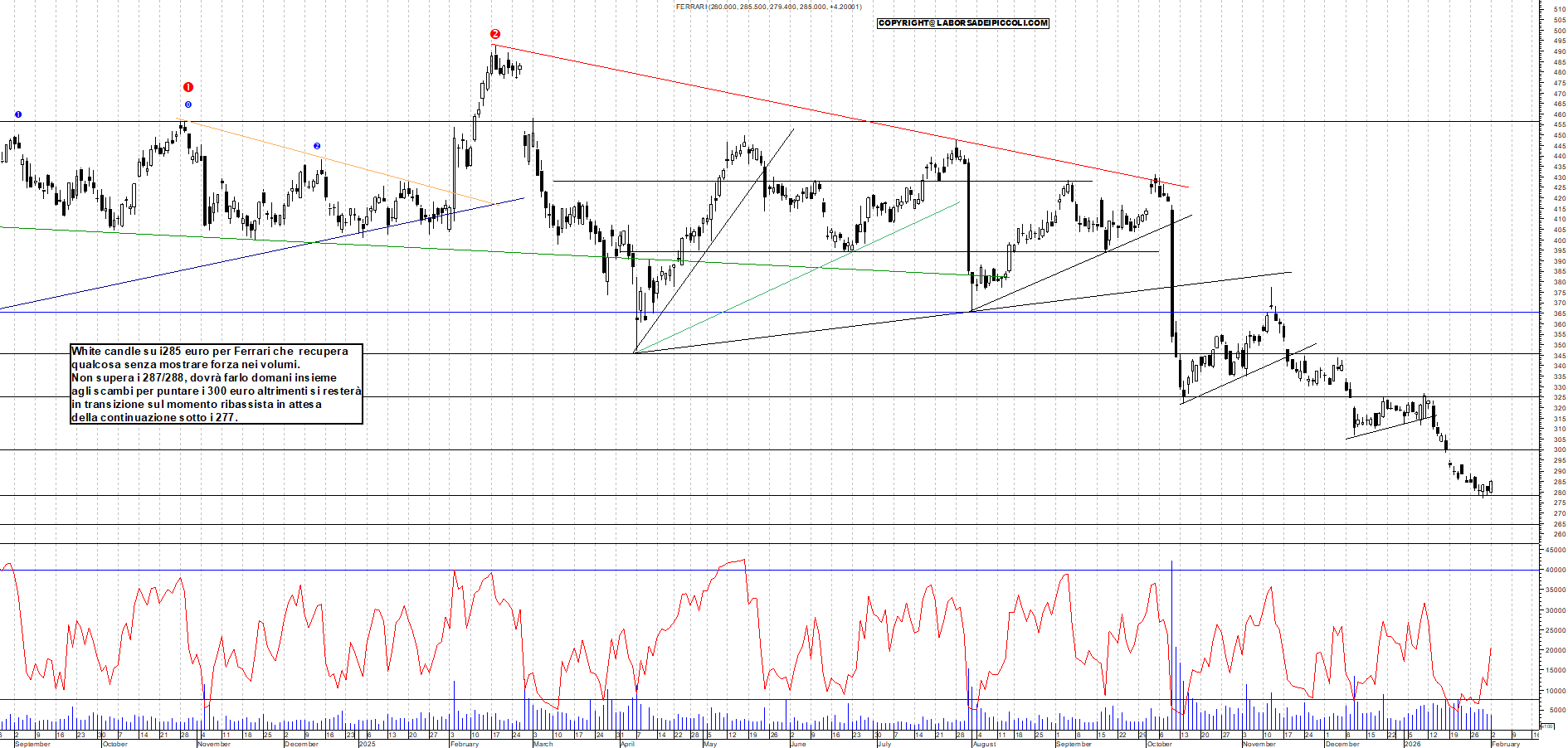 FERRARI: White candle su i285 euro per Ferrari che recupera qualcosa senza mostrare forza nei volumi. Non supera i 287/288, dovrà farlo domani insieme agli scambi per puntare i 300 euro altrimenti si resterà in transizione sul momento ribassista in attesa della continuazione sotto i 277.
