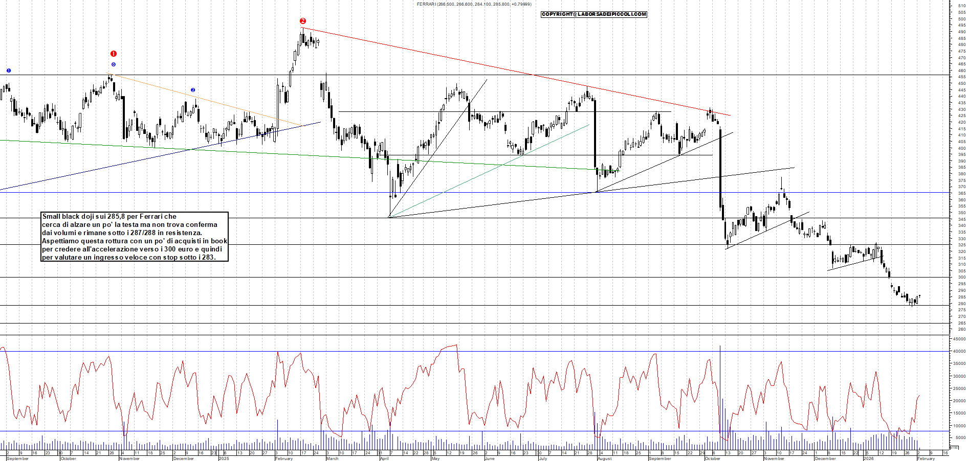 FERRARI: Small black doji sui 285,8 per Ferrari che cerca di alzare un po' la testa ma non trova conferma dai volumi e rimane sotto i 287/288 in resistenza. Aspettiamo questa rottura con un po' di acquisti in book per credere all'accelerazione verso i 300 euro e quindi per valutare un ingresso veloce con stop sotto i 283.