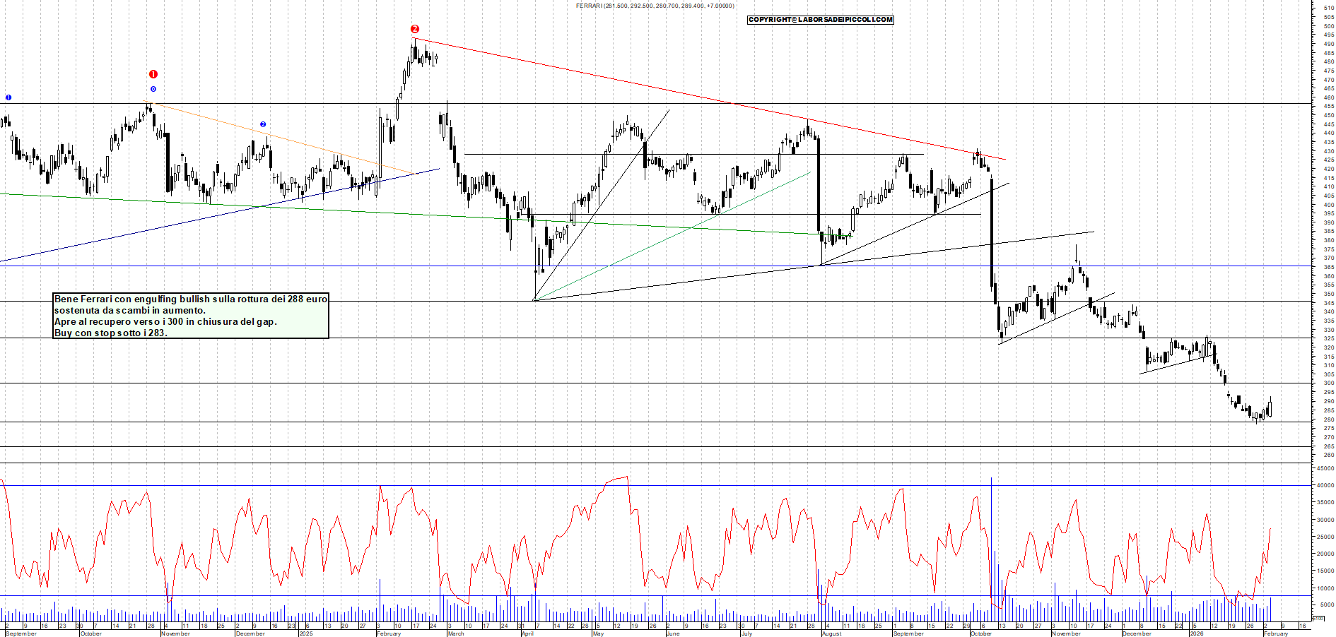 FERRARI: Bene Ferrari con engulfing bullish sulla rottura dei 288 euro sostenuta da scambi in aumento. Apre al recupero verso i 300 in chiusura del gap. Buy con stop sotto i 283.