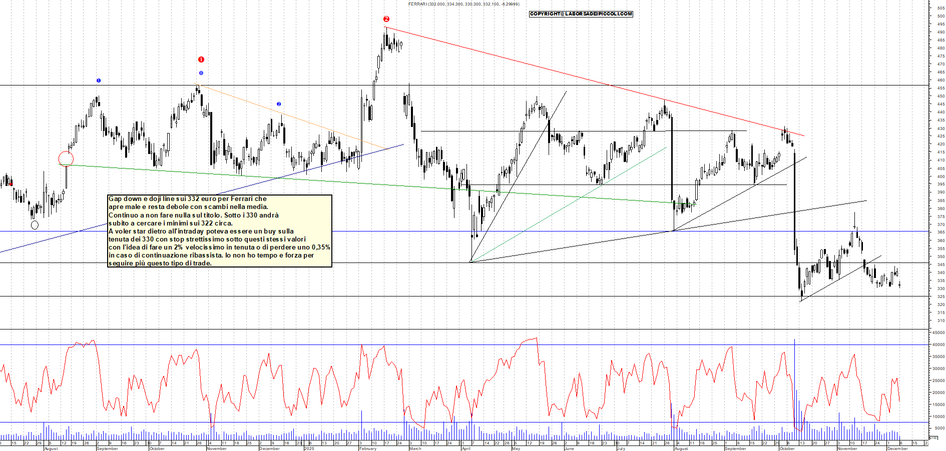 FERRARI: Gap down e doji line sui 332 euro per Ferrari che apre male e resta debole con scambi nella media. Continuo a non fare nulla sul titolo. Sotto i 330 andrà subito a cercare i minimi sui 322 circa. A voler star dietro all'intraday poteva essere un buy sulla tenuta dei 330 con stop strettissimo sotto questi stessi valori con l'idea di fare un 2% velocissimo in tenuta o di perdere uno 0,35% in caso di continuazione ribassista. Io non ho tempo e forza per seguire più questo tipo di trade.