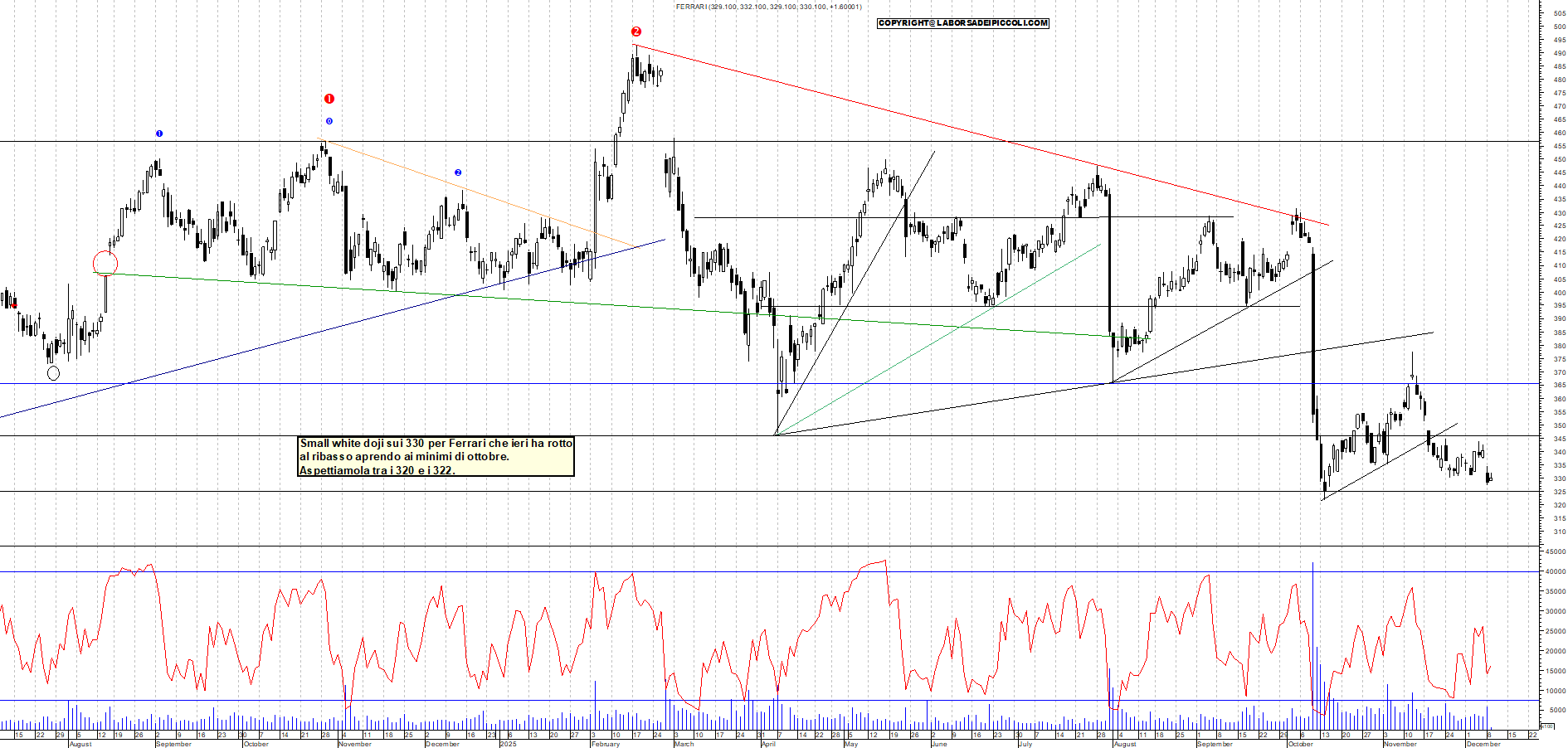 FERRARI: Small white doji sui 330 per Ferrari che ieri ha rotto al ribasso aprendo ai minimi di ottobre. Aspettiamola tra i 320 e i 322.