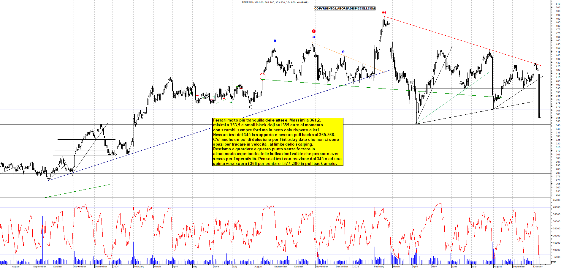 FERRARI: Ferrari molto più tranquilla delle attese. Massimi a 361,2, minimi a 353,5 e small black doji sui 355 euro al momento con scambi sempre forti ma in netto calo rispetto a ieri. Nessun test dei 345 in supporto e nessun pull back sui 365-366. C'e' anche un po' di delusione per l'intraday dato che non ci sono spazi per tradare in velocità , al limite dello scalping. Restiamo a guardare a questo punto senza forzare in alcun modo aspettando delle indicazioni valide che possano aver senso per l'operatività. Penso al test con reazione dai 345 o ad una spinta vera sopra i 366 per puntare i 377-.380 in pull back ampio.