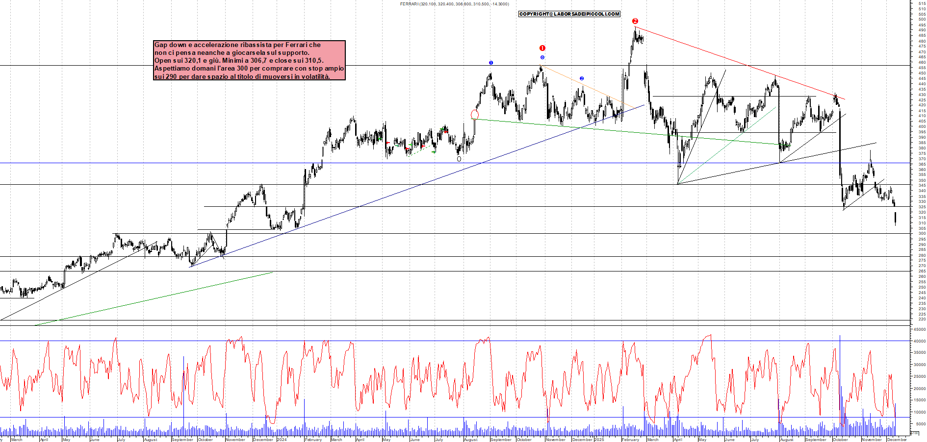 FERRARI: Gap down e accelerazione ribassista per Ferrari che non ci pensa neanche a giocarsela sul supporto. Open sui 320,1 e giù. Minimi a 306,7 e close sui 310,5. Aspettiamo domani l'area 300 per comprare con stop ampio sui 290 per dare spazio al titolo di muoversi in volatilità.