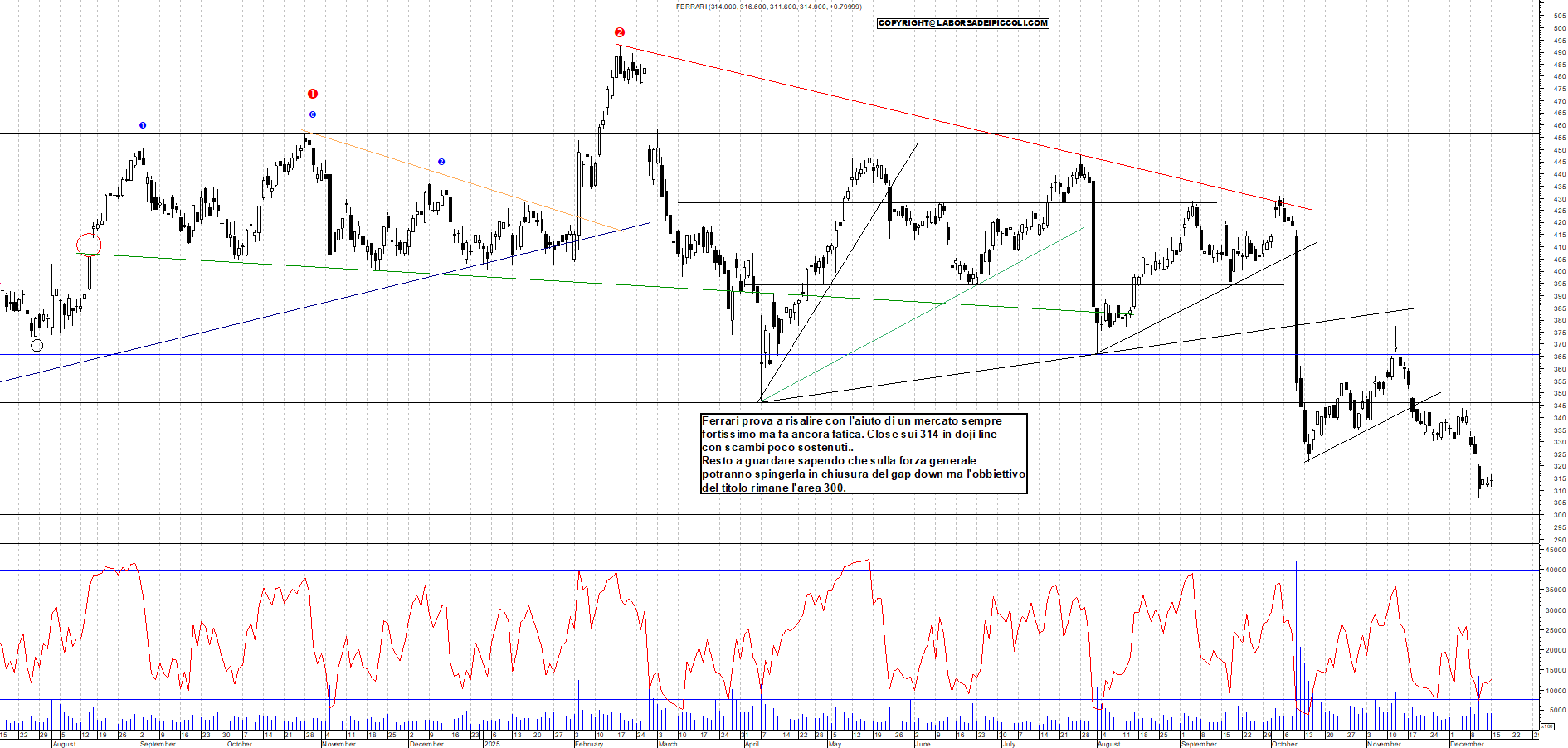 FERRARI: Ferrari prova a risalire con l'aiuto di un mercato sempre fortissimo ma fa ancora fatica. Close sui 314 in doji line con scambi poco sostenuti.. Resto a guardare sapendo che sulla forza generale potranno spingerla in chiusura del gap down ma l'obbiettivo del titolo rimane l'area 300.