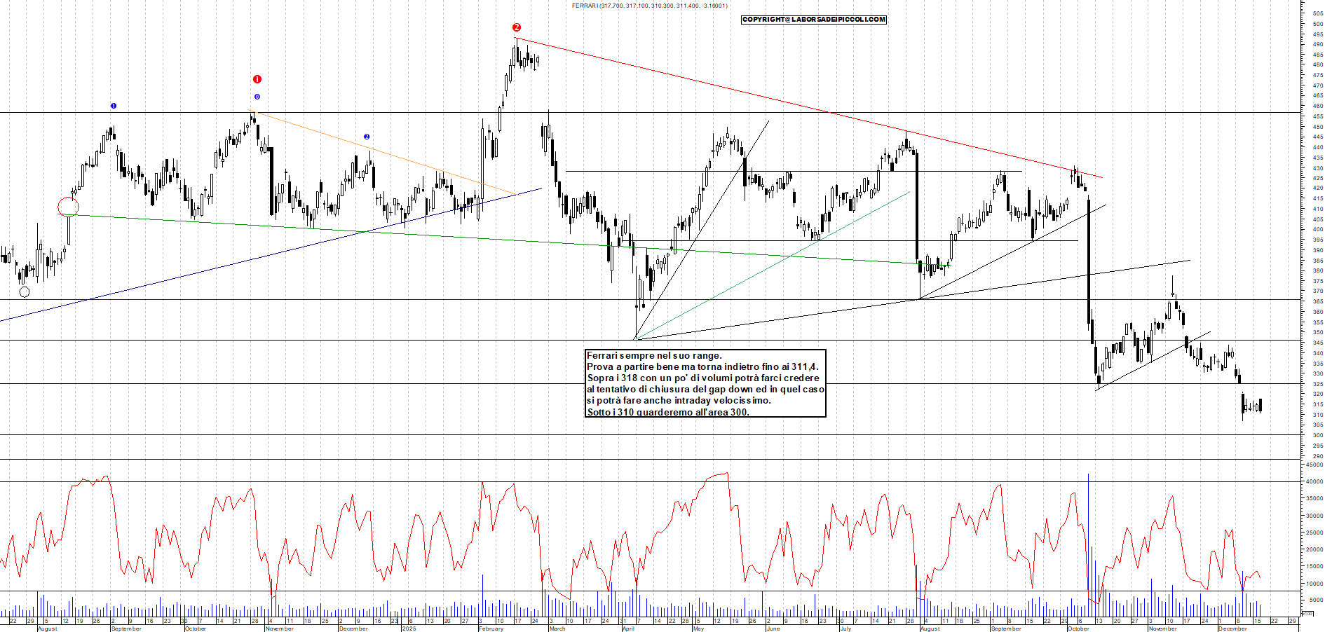 FERRARI: Ferrari sempre nel suo range. Prova a partire bene ma torna indietro fino ai 311,4. Sopra i 318 con un po' di volumi potrà farci credere al tentativo di chiusura del gap down ed in quel caso si potrà fare anche intraday velocissimo. Sotto i 310 guarderemo all'area 300.