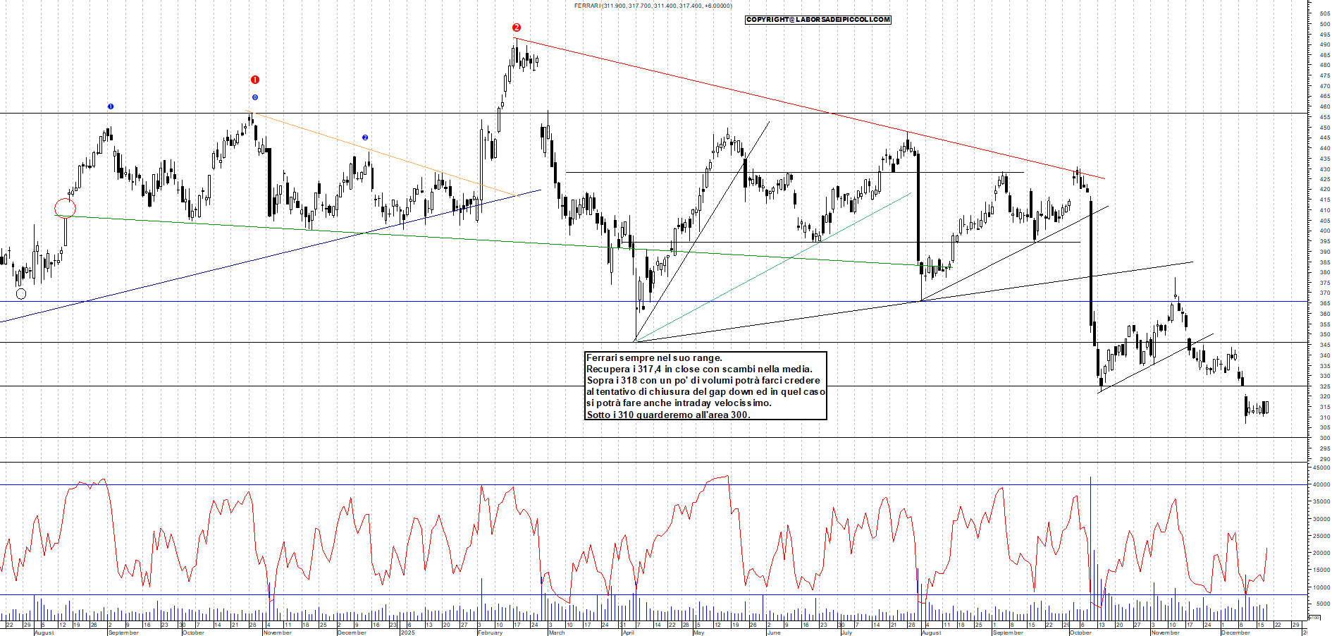 FERRARI: Ferrari sempre nel suo range. Recupera i 317,4 in close con scambi nella media. Sopra i 318 con un po' di volumi potrà farci credere al tentativo di chiusura del gap down ed in quel caso si potrà fare anche intraday velocissimo. Sotto i 310 guarderemo all'area 300.