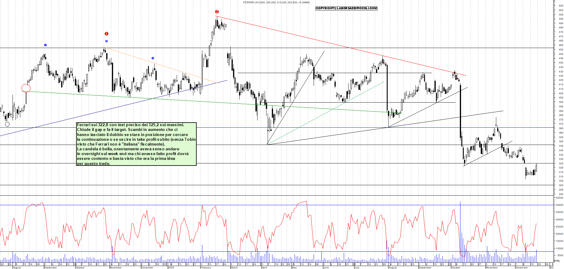 FERRARI: Ferrari sui 322,8 con test preciso dei 325,2 sui massimi. Chiude il gap e fa il target. Scambi in aumento che ci hanno lasciato il dubbio se stare in posizione per cercare la continuazione o se uscire in take profit subito (senza Tobin visto che Ferrari non è "italiana" fiscalmente). La candela è bella, onestamente aveva senso andare in overnight sul week end ma chi avesse fatto profit dovrà essere contento e basta visto che era la prima idea per questo trade.