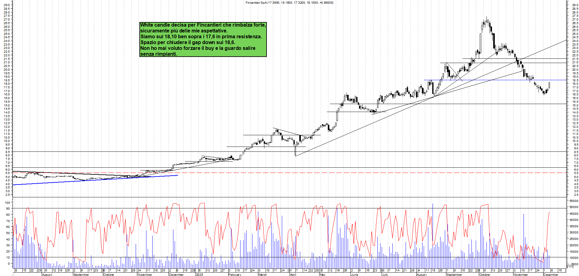 FINCANTIERI: White candle decisa per Fincantieri che rimbalza forte, sicuramente più delle mie aspettative. Siamo sui 18,10 ben sopra i 17,6 in prima resistenza. Spazio per chiudere il gap down sui 18,6. Non ho mai voluto forzare il buy e la guardo salire senza rimpianti.