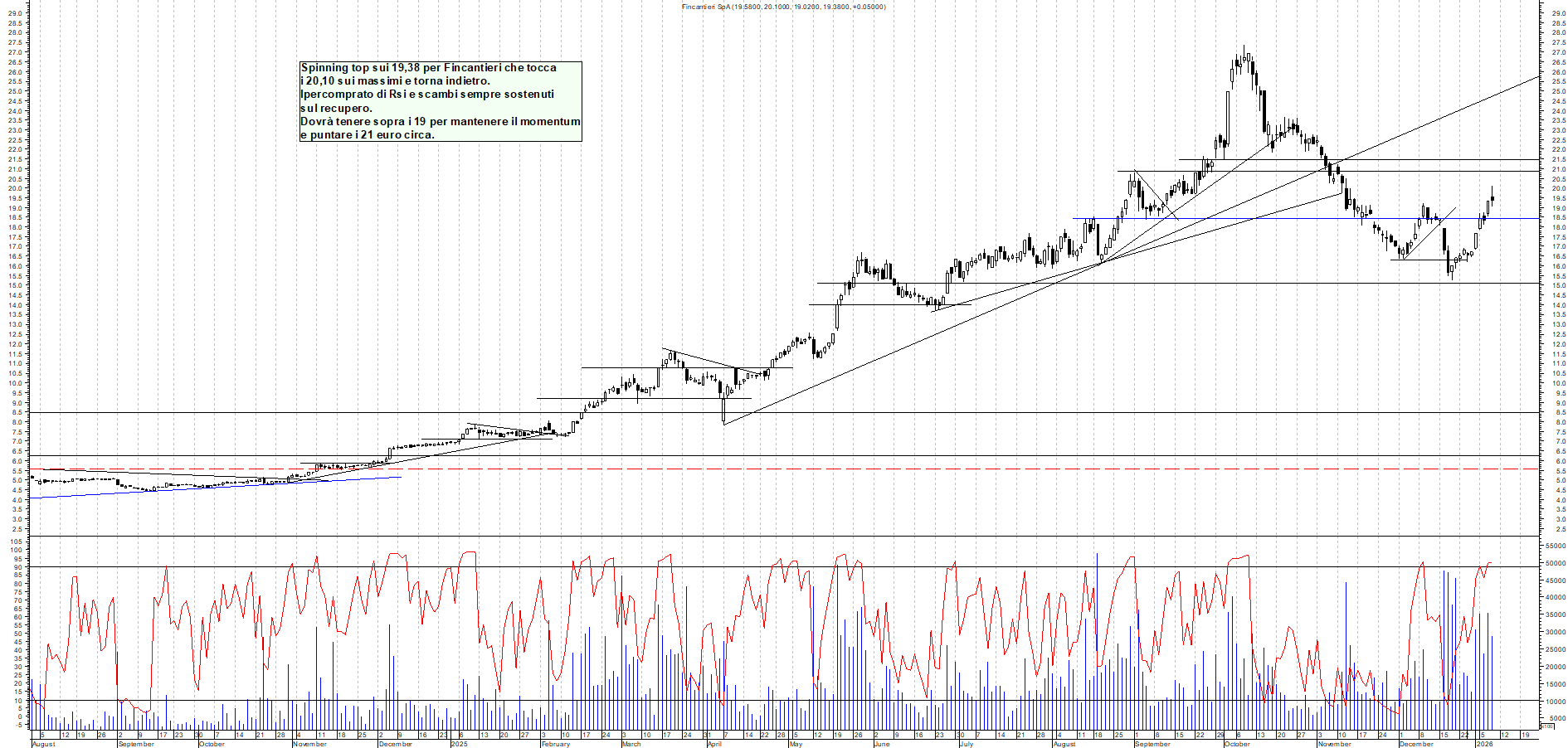 FINCANTIERI: Spinning top sui 19,38 per fincantieri che tocca i 20,10 sui massimi e torna indietro. ipercomprato di rsi e scambi sempre sostenuti sul recupero. dovrà tenere sopra i 19 per mantenere il momentum e puntare i 21 euro circa.