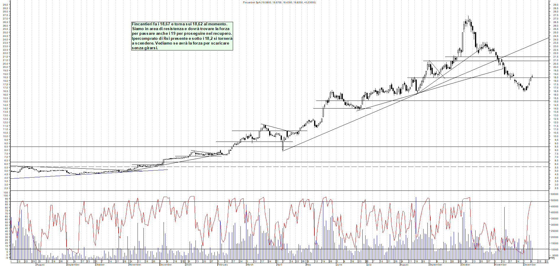 FINCANTIERI: Fincantieri fa i 18,67 e torna sui 18,62 al momento. Siamo in area di resistenza e dovrà trovare la forza per passare anche i 19 per proseguire nel recupero. Ipercomprato di Rsi presente e sotto i 18,2 si tornerà a scendere. Vediamo se avrà la forza per scaricare senza girarsi.