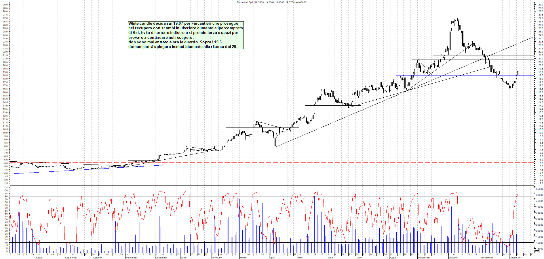 FINCANTIERI: White candle decisa sui 19,07 per Fincantieri che prosegue nel recupero con scambi in ulteriore aumento e ipercomprato di Rsi. Evita di tornare indietro e si prende forza e spazi per provare a continuare nel recupero. Non sono mai entrato e ora la guardo. Sopra i 19,3 domani potrà spingere immediatamente alla ricerca dei 20.