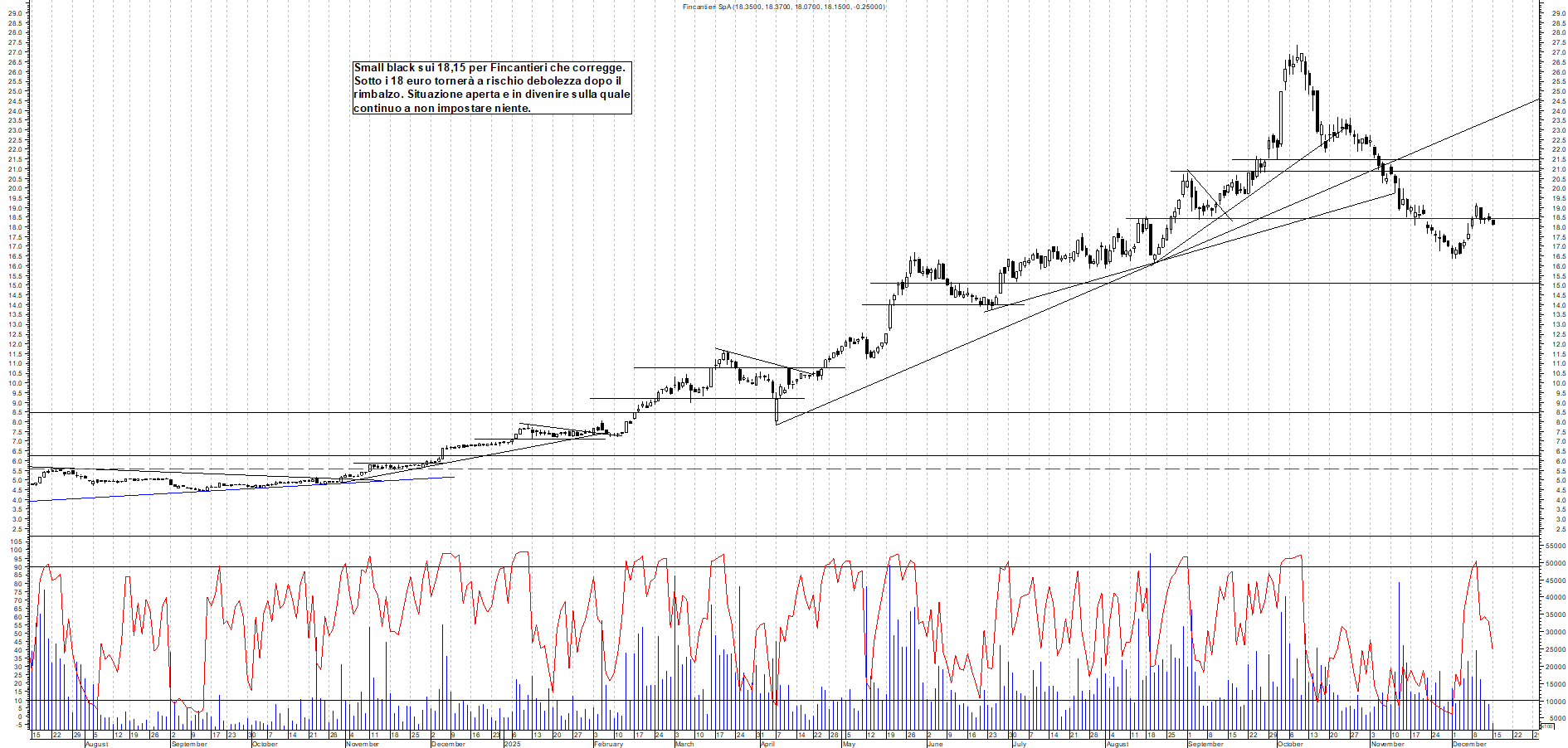 FINCANTIERI: Small black sui 18,15 per Fincantieri che corregge. Sotto i 18 euro tornerà a rischio debolezza dopo il rimbalzo. Situazione aperta e in divenire sulla quale continuo a non impostare niente.