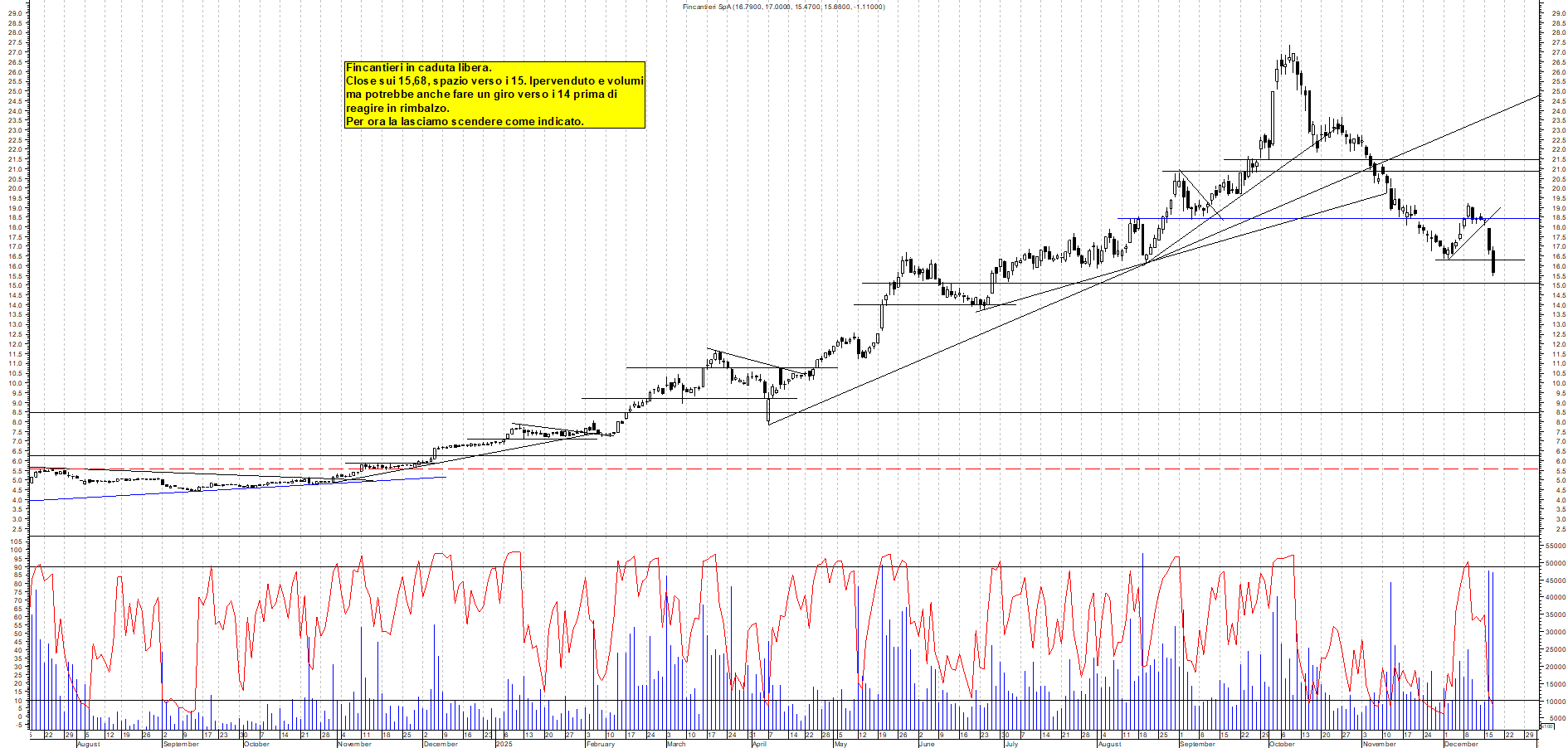 FINCANTIERI: Fincantieri in caduta libera. Close sui 15,68, spazio verso i 15. Ipervenduto e volumi ma potrebbe anche fare un giro verso i 14 prima di reagire in rimbalzo. Per ora la lasciamo scendere come indicato.