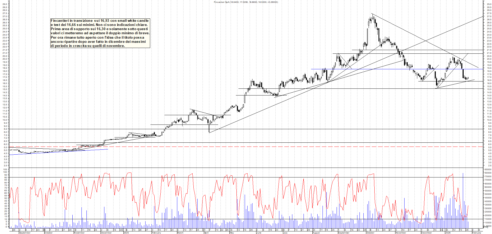 FINCANTIERI: Fincantieri in transizione sui 16,93 con small white candle e test dei 16,66 sui minimi. Non ci sono indicazioni chiare. Prima area di supporto sui 16,30 e solamente sotto questi valori ci metteremo ad aspettare il doppio minimo di breve. Per ora rimane tutto aperto con l'idea che il titolo possa ancora ripartire dopo aver fatto in dicembre dei massimi di periodo in crescita su quelli di novembre.