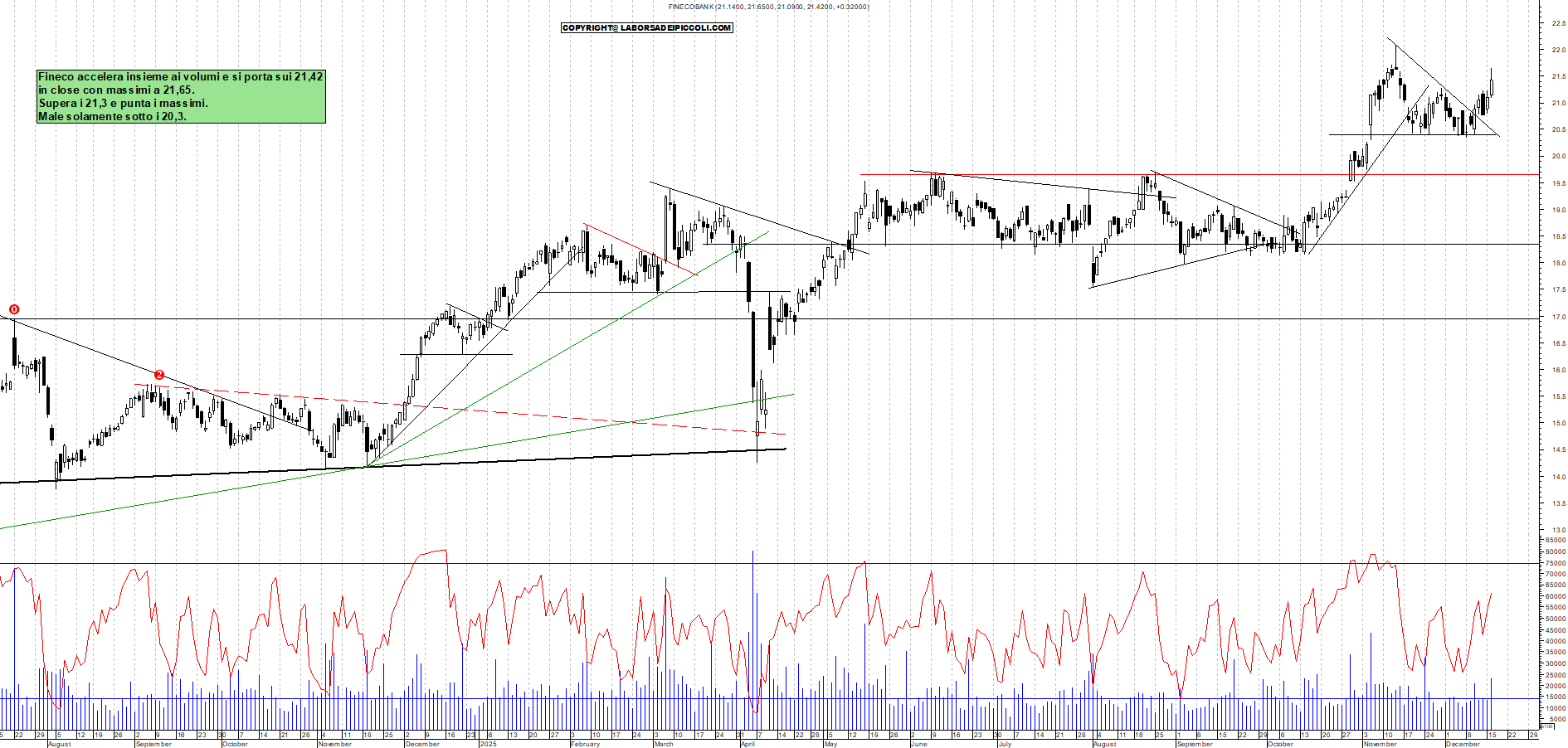 FINECO: Fineco accelera insieme ai volumi e si porta sui 21,42 in close con massimi a 21,65. Supera i 21,3 e punta i massimi. Male solamente sotto i 20,3.