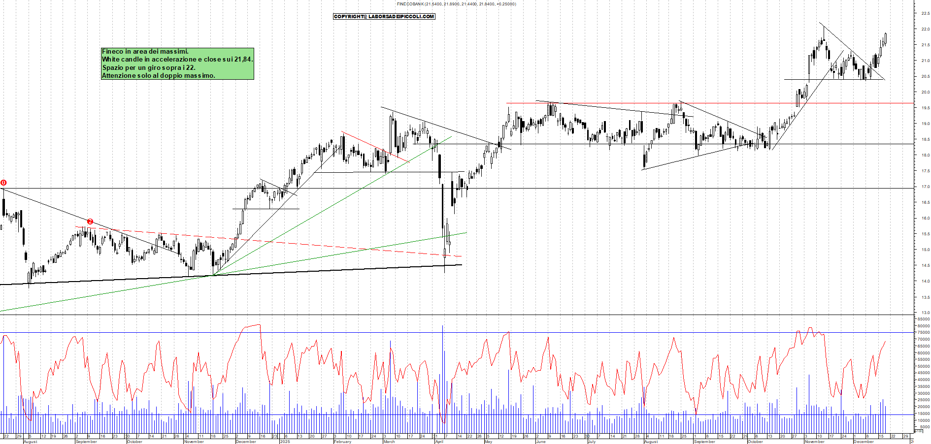 FINECO: Fineco in area dei massimi. White candle in accelerazione e close sui 21,84. Spazio per un giro sopra i 22. Attenzione solo al doppio massimo.