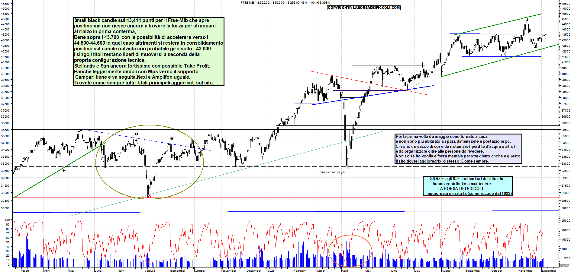 FTSEMIB: Small black candle sui 43,414 punti per il Ftse-Mib che apre positivo ma non riesce ancora a trovare la forza per strappare al rialzo in prima conferma, Bene sopra i 43.700 con la possibilità di accelerare verso i 44.500-44.600 in quel caso altrimenti si resterà in consolidamento positivo sul canale rialzista con probabile giro sotto i 43.000. I singoli titoli restano liberi di muoversi a seconda della propria configurazione tecnica. Stellantis e Stm ancora fortissime con possibile Take Profit. Banche leggermente deboli con Mps verso il supporto. Campari tiene e va seguita.Nexi e Amplifon uguale. Trovate come sempre tutti i titoli principali aggiornati sul sito.