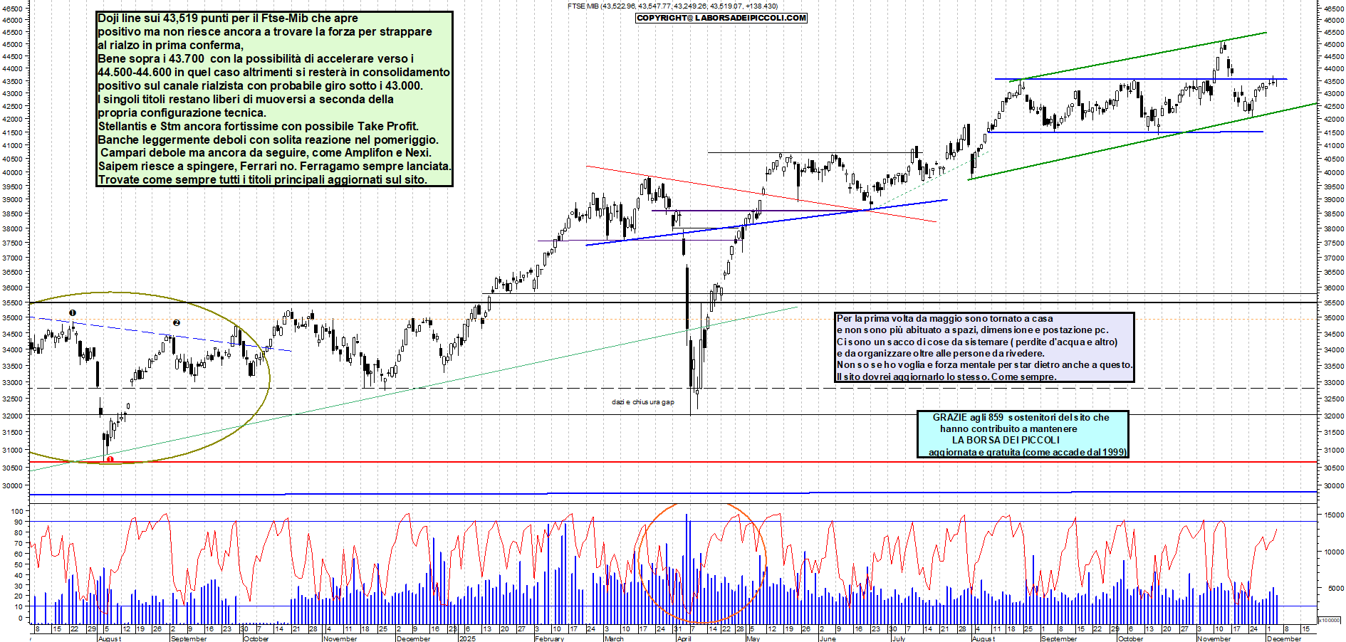 FTSEMIB: Doji line sui 43,519 punti per il Ftse-Mib che apre positivo ma non riesce ancora a trovare la forza per strappare al rialzo in prima conferma, Bene sopra i 43.700 con la possibilità di accelerare verso i 44.500-44.600 in quel caso altrimenti si resterà in consolidamento positivo sul canale rialzista con probabile giro sotto i 43.000. I singoli titoli restano liberi di muoversi a seconda della propria configurazione tecnica. Stellantis e Stm ancora fortissime con possibile Take Profit. Banche leggermente deboli con solita reazione nel pomeriggio. Campari debole ma ancora da seguire, come Amplifon e Nexi. Saipem riesce a spingere, Ferrari no. Ferragamo sempre lanciata. Trovate come sempre tutti i titoli principali aggiornati sul sito.